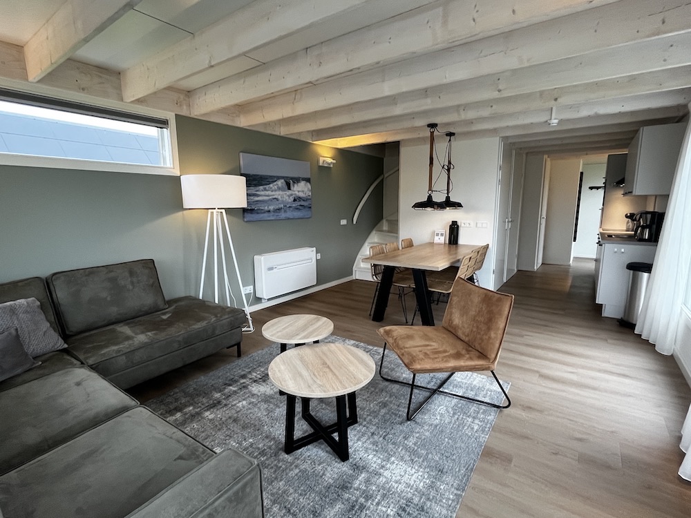 In de open living vindt u de loungehoek, de eethoek en de keuken. Hier kunt u heerlijk vakantie vieren met het gezin. De grote raampartijen zorgen deze voor natuurlijk lichtinval en prachtig uitzicht. De gezellige loungehoek is ingericht met een hoekbank, een fauteuil, een salontafel en een tv-meubel met daarboven een tv. De CAI-aansluiting zorgt ervoor dat tv-zenders kunnen worden ontvangen en internet is aanwezig. De airco zorgt voor verkoeling in de zomer.