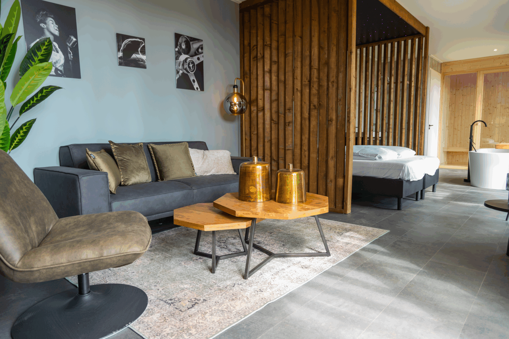 Modus Wellness - De Modus Wellness 2 doet denken aan een luxe hotelkamer plus heerlijke wellnessfaciliteiten. Het gelijkvloerse en vrijstaande chalet biedt plaats aan 2 personen. De woon-slaapkamer is warm ingericht. U vindt er een tweepersoonsbed met een zogenaamde sterrenhemel als verlichting, een eethoek en een zithoek met televisie. Er is een badkamer met een ligbad, ruime regendouche, wastafel en traditionele sauna. De open keuken is onder andere uitgerust met een vaatwasser, koelkast en een filter koffiezetapparaat. Ook is er een apart toilet aanwezig. Buiten is een terras met tuinmeubilair. U kunt 1 auto bij het chalet parkeren en er is wifi aanwezig.