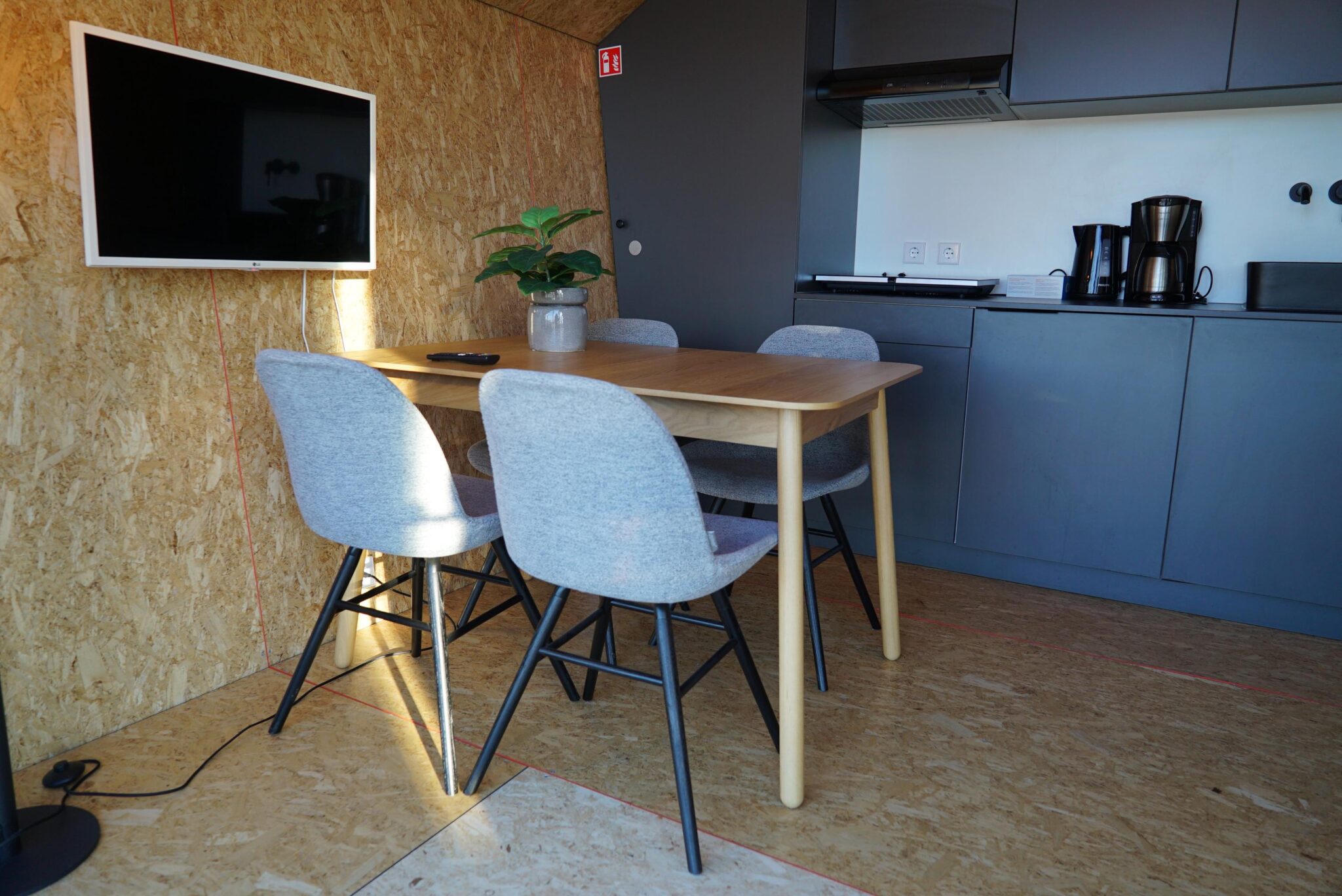 Solo Retreat 4 – Das Solo Retreat 4 bietet allen Komfort auf einer kleinen Quadratmeterzahl. Das Chalet ist ebenerdig und für 4 Personen geeignet. Im modern eingerichteten Wohnbereich finden Sie eine Sitzecke mit Fernseher, einen Esstisch mit Stühlen sowie eine Küche, die unter anderem mit einem Induktionskochfeld, einem Wasserkocher und einer Kaffeemaschine ausgestattet ist.