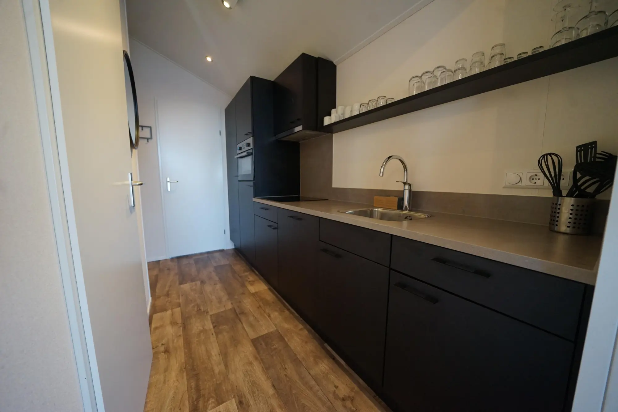 Het gevoel van rust en ruimte is ook van toepassing wanneer u de woning binnengaat. U komt direct in de grote living met open keuken die bestaat uit een keukenblok en alle benodigde keukenaccessoires. Dit laatste houdt in dat u beschikt over een kookplaat, afzuigkap, koel-vriescombinatie, vaatwasser, magnetron, oven en een kraan met daaronder een rvs spoelbak. Door de sfeervolle inrichting laat deze woning u thuis voelen. Deze ruimte is perfect om samen te komen met familie en/of vrienden. Door de aansluitingen voor de tv en het internet, is deze woning van alle gemakken voorzien.