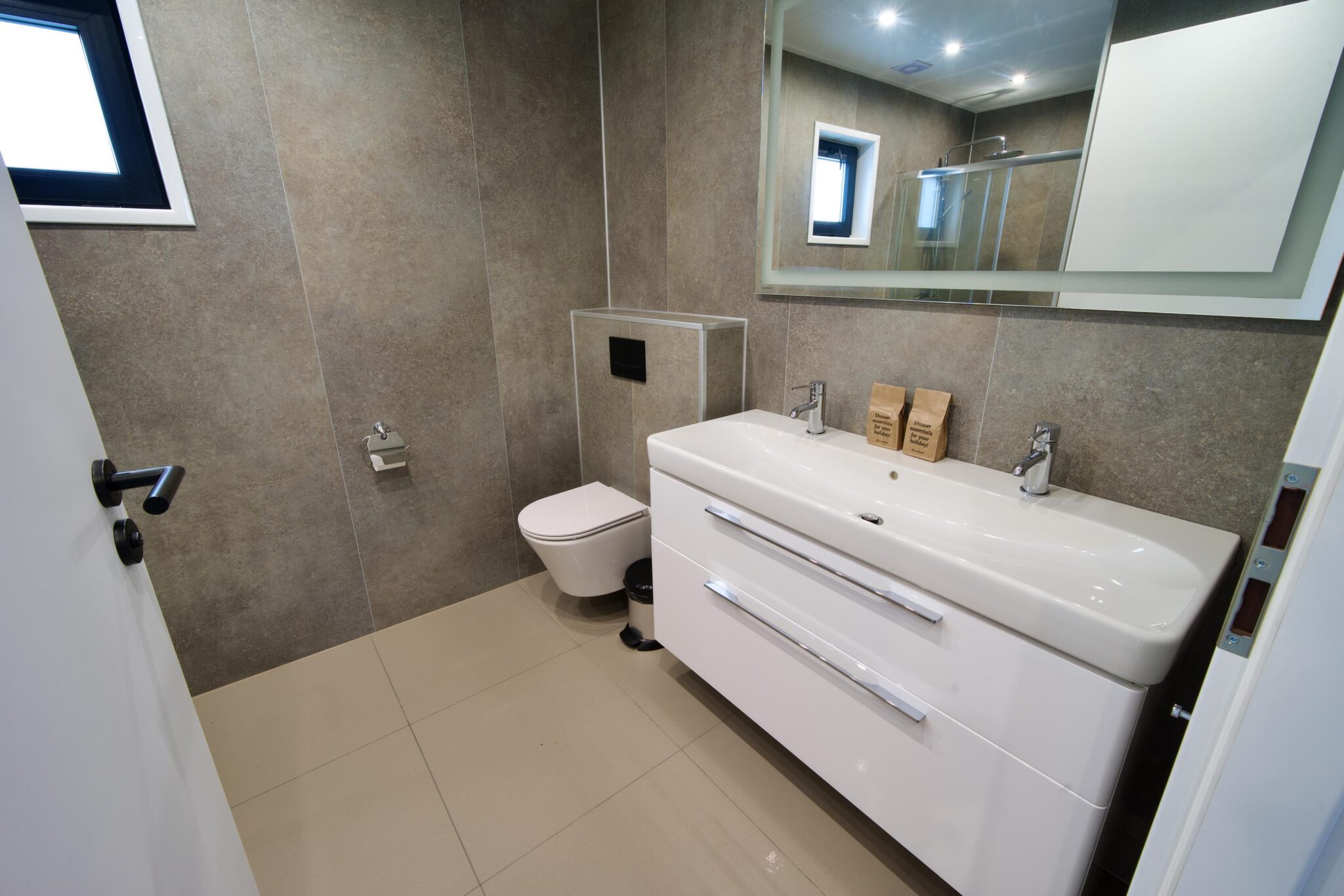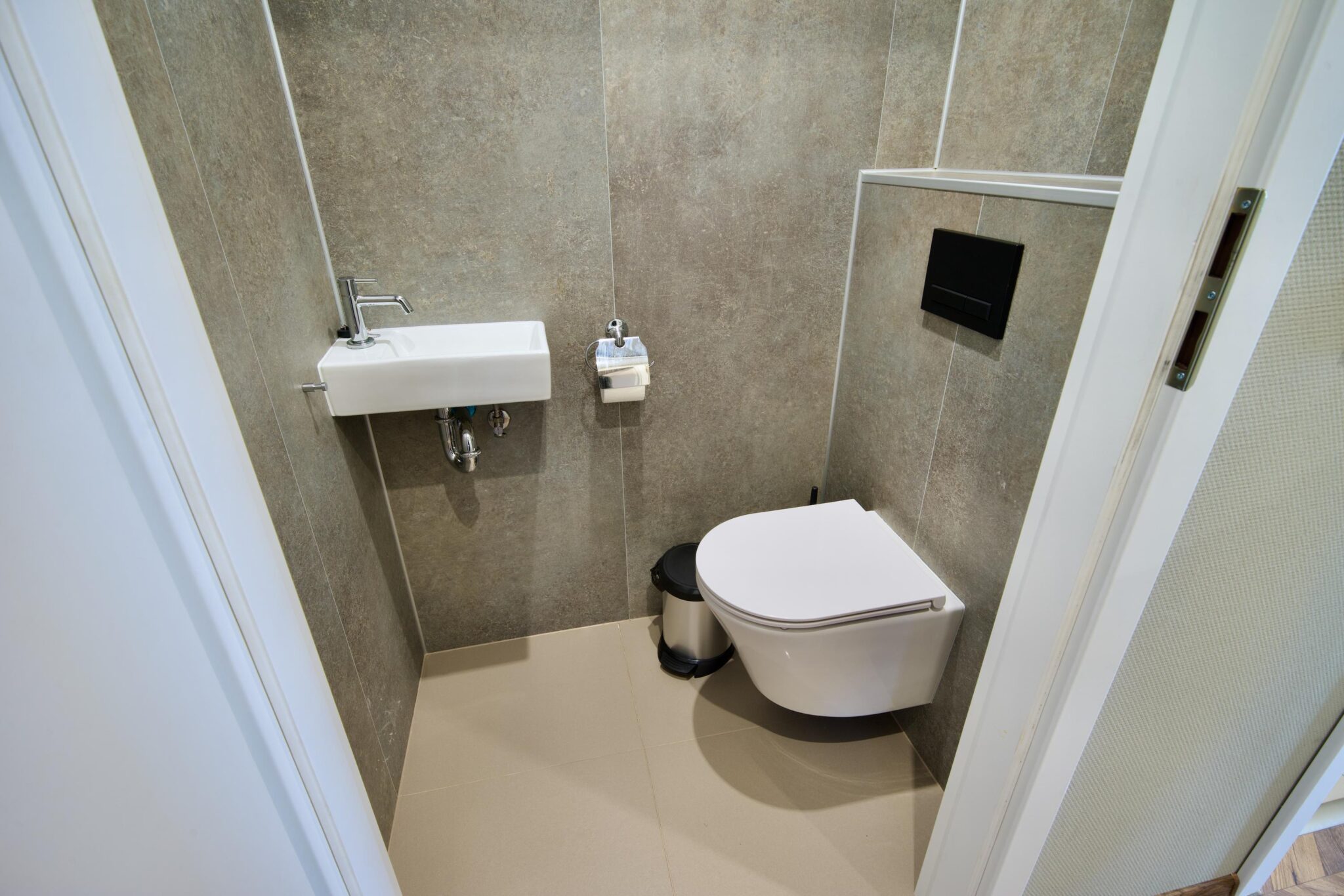 De badkamer is modern en stijlvol afgewerkt en beschikt over een ruime douche en wastafel. Daarnaast is er een separaat toilet aanwezig, wat extra privacy en gebruiksgemak biedt.