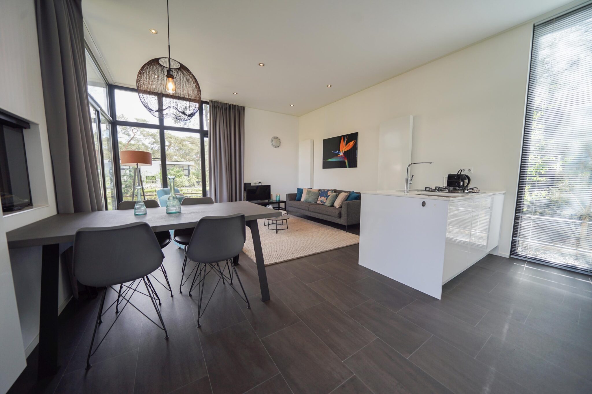 Het gevoel van rust en ruimte is ook van toepassing wanneer u de woning binnengaat. U komt direct in de grote living met open keuken die bestaat uit een keukenblok en alle benodigde keukenaccessoires. Dit laatste houdt in dat u beschikt over een kookplaat, afzuigkap, koel-vriescombinatie, vaatwasser, magnetron, oven en een kraan met daaronder een rvs spoelbak.
