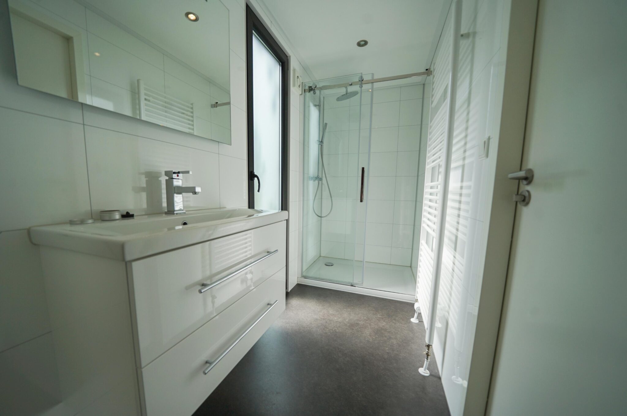 Vanuit de living heeft u direct toegang tot de gang waar de twee slaapkamers en de badkamer zijn gelegen. Voor beide geldt dat, net als bij de living en de keuken, ze compleet met mooie materialen worden ingericht.