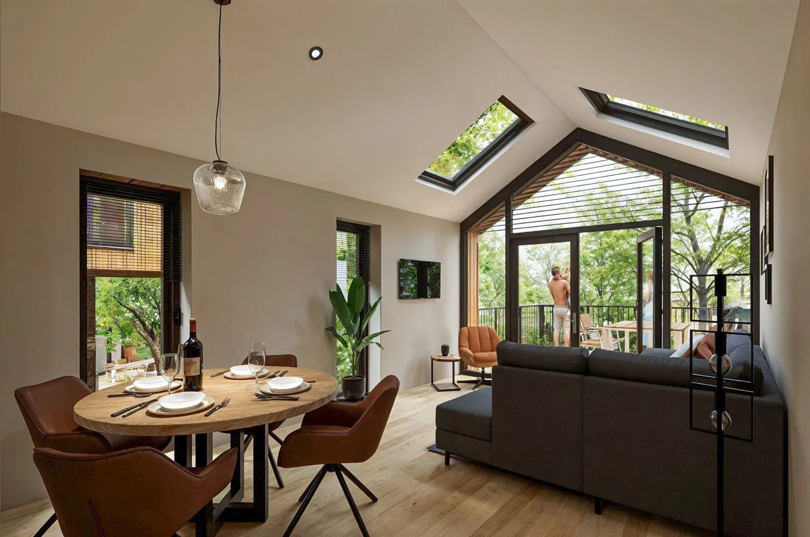 De boomhut biedt een sfeervolle woonkamer met open keuken, een moderne badkamer met douche, wastafel en toilet, en twee knusse slaapkamers — ideaal voor gezinnen of stellen die iets bijzonders zoeken.