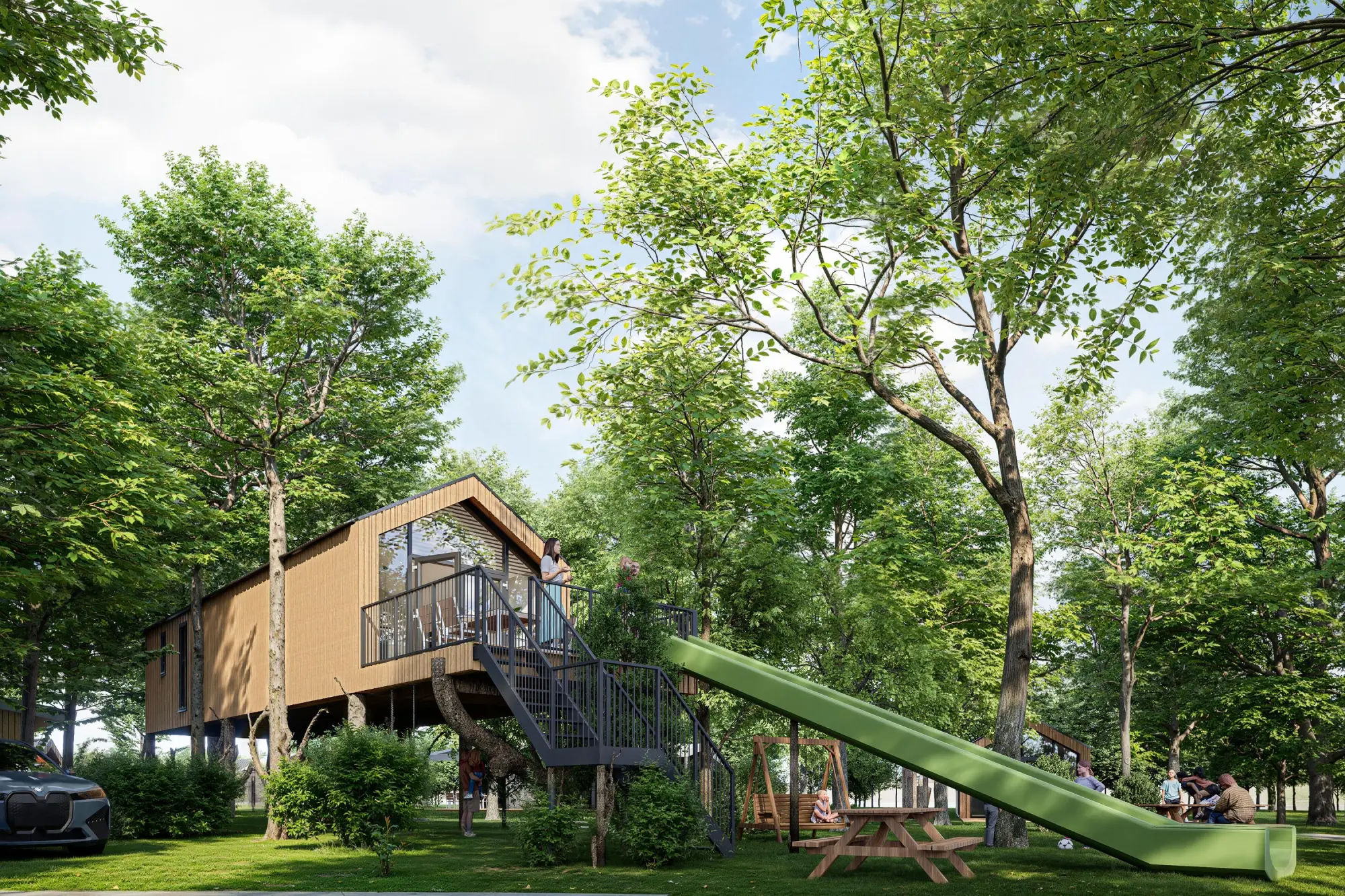 Deze unieke recreatiewoning, gebouwd in 2025, heeft een woonoppervlakte van 45 m² en biedt ruimte aan vier personen. De boomhut beschikt over twee slaapkamers, een gezellige woonkamer en een moderne open keuken. Dankzij de slimme indeling ervaart u een verrassend gevoel van ruimte, met volop licht en een warm, natuurlijk interieur. De boomhutrecreatiewoning bevindt zich 2,5 meter boven het maaiveld en beschikt over een glijbaan.