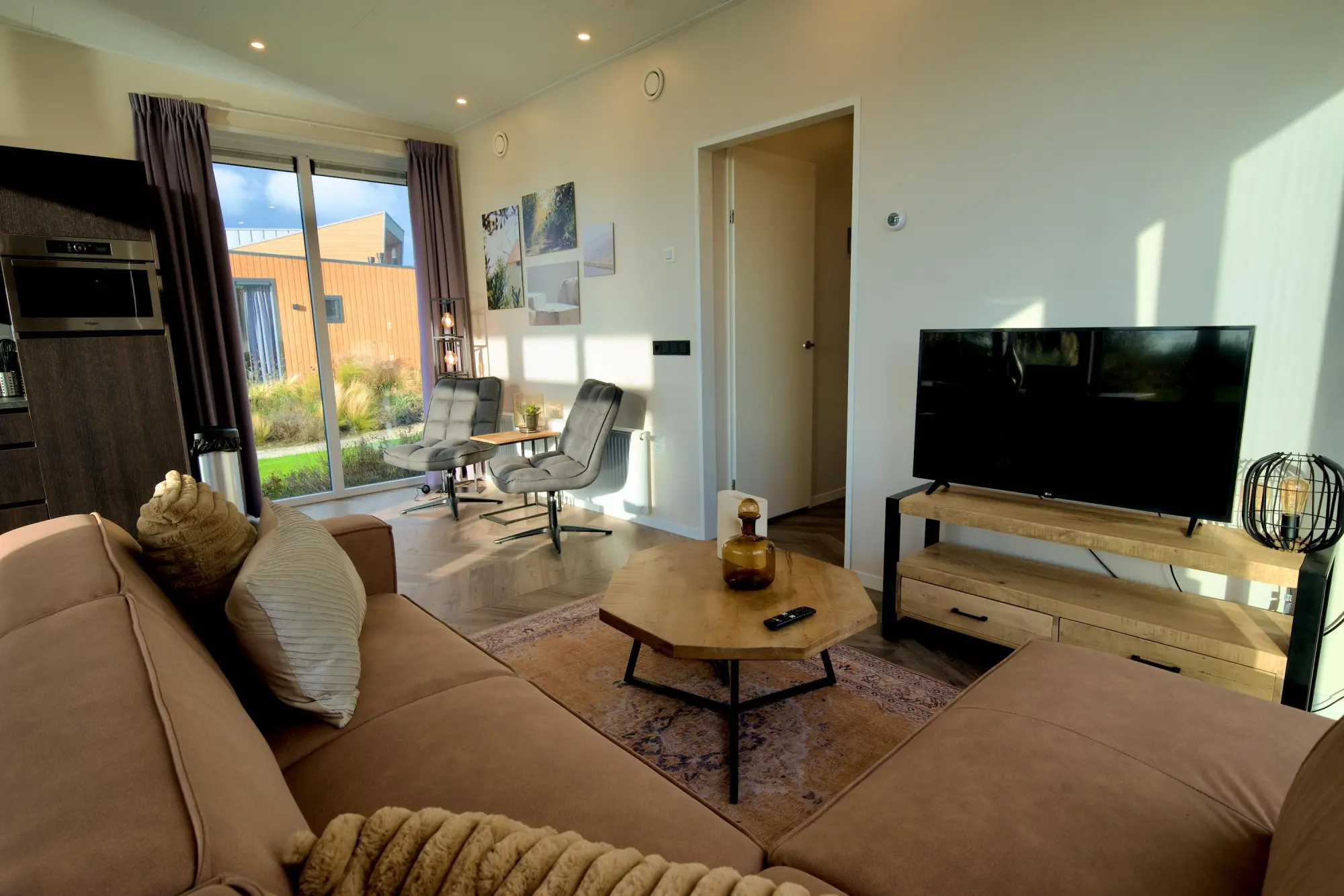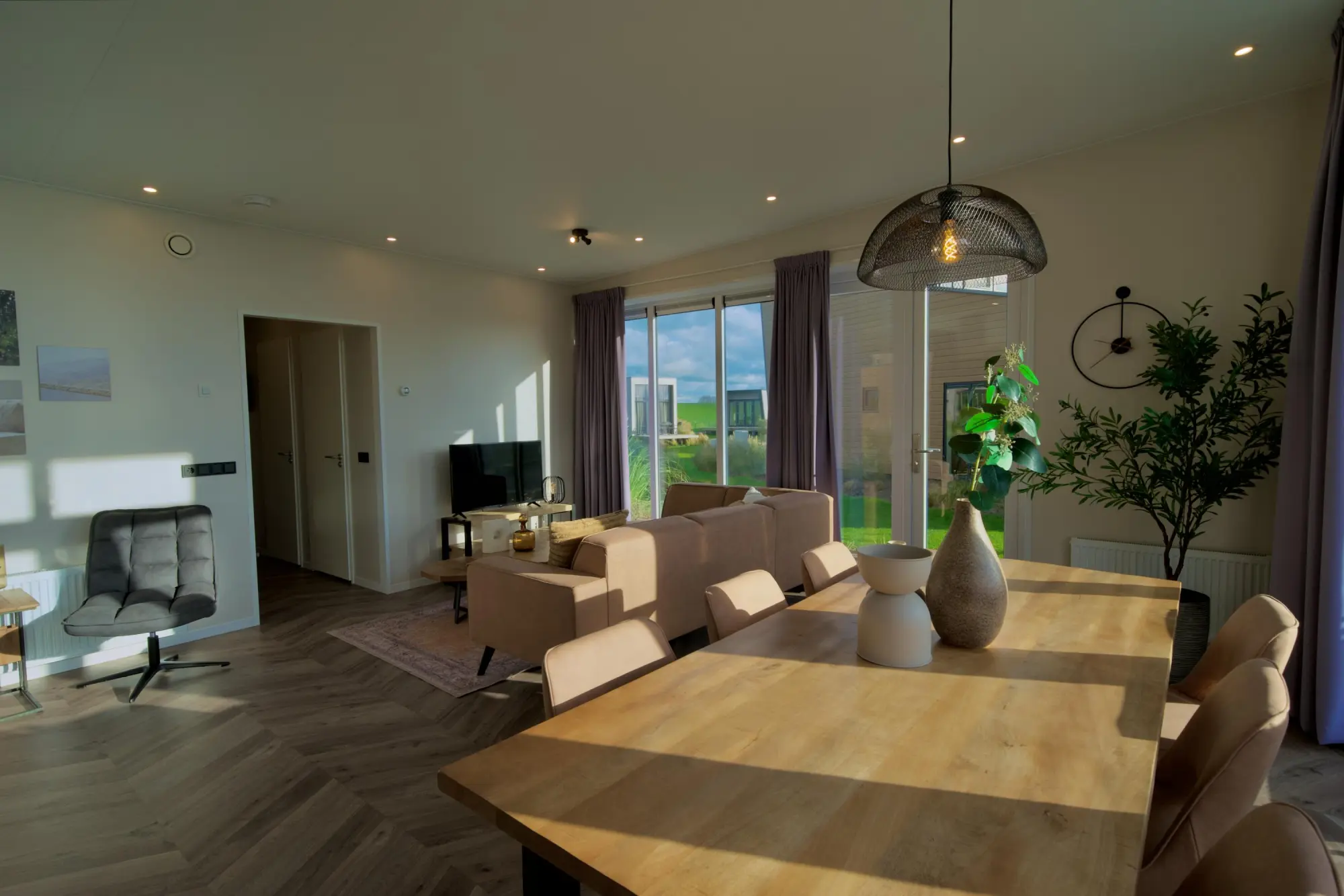 De vakantiewoning beschikt over een aantrekkelijk terras en een mooi aangelegde tuin die uitnodigt tot ontspanning in de buitenlucht. Dankzij de grote raampartijen heeft u vanuit de living altijd verbinding met buiten. De tuin wordt compleet opgeleverd, zodat u hier direct kunt genieten van uw vrije tijd.