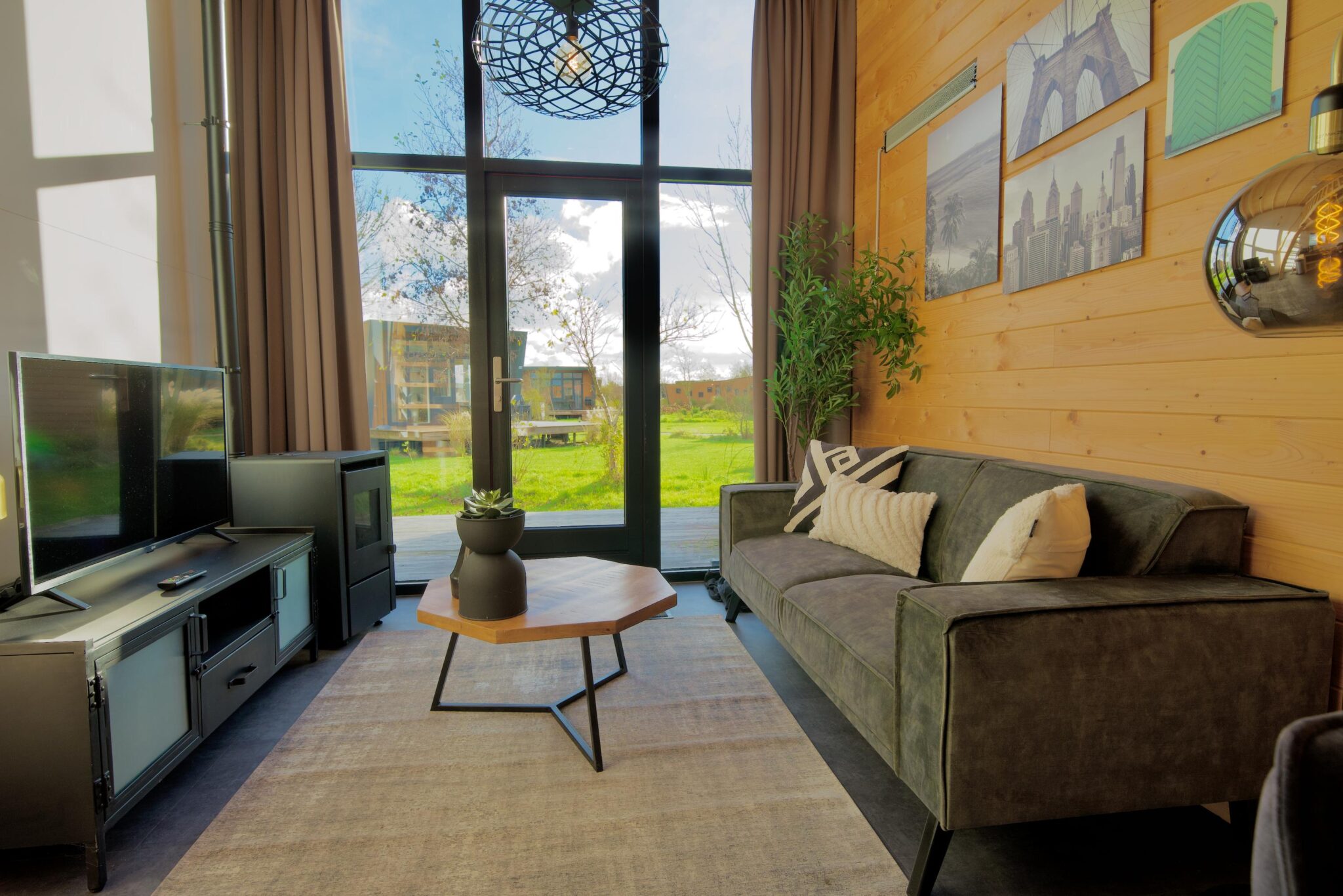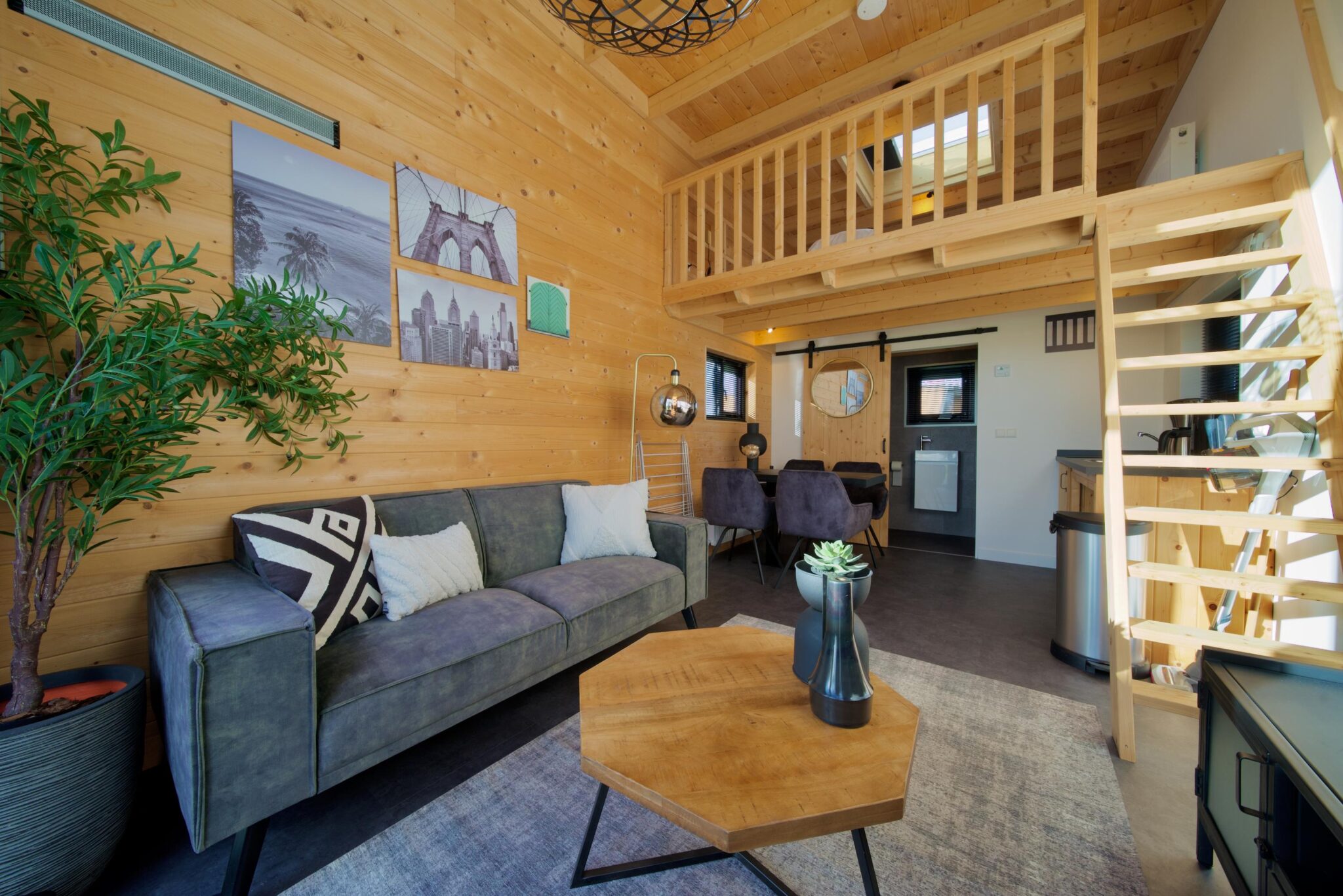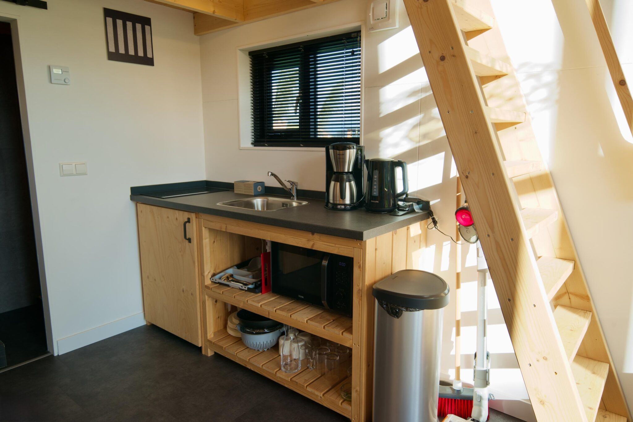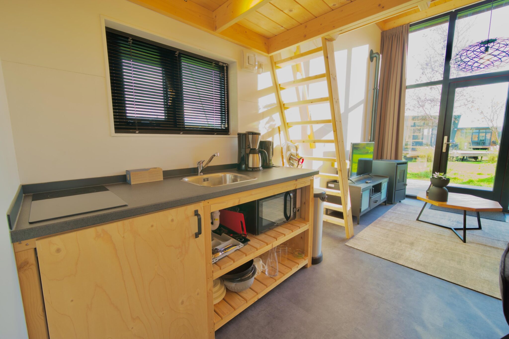 De begane grond beschikt over een knusse woonkamer met zithoek, televisie en palletkachel die warmte en sfeer toevoegt. De keuken is voorzien van een kookplaat, koffiezetapparaat en magnetron en wordt aangevuld met een kleine maar praktische eethoek. De badkamer is uitgerust met een douche, wastafel en toilet. De trap leidt naar de slaapvide met tweepersoonsbed, gelegen direct onder het dak.