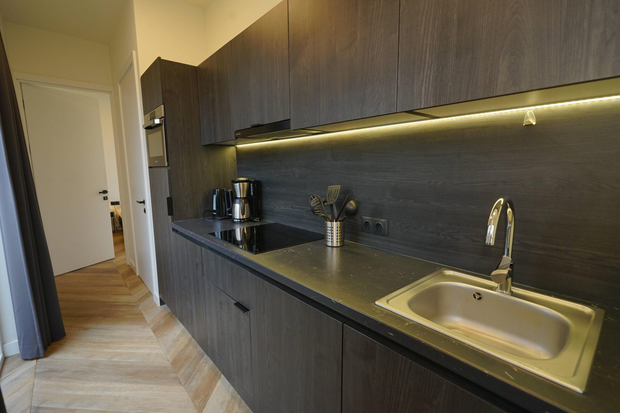 De gezamenlijke ruimte is ingericht met een gezellige zithoek en televisie, een eethoek en een keuken met onder andere een vaatwasser, magnetron en een waterkoker.