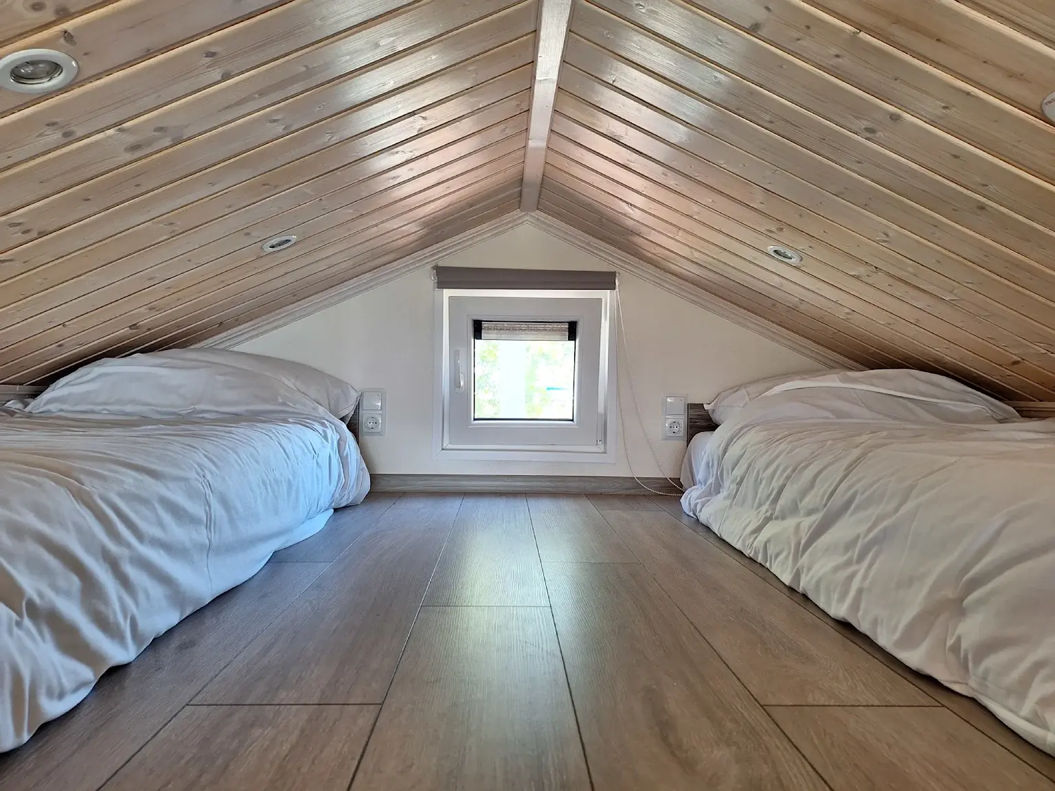 Lodge 4 - Type Lodge is geschikt voor vier personen. Deze knusse recreatiewoning is voorzien van een glazen gevel die u een vrij uitzicht biedt. Verder bevind zich beneden een open keuken in hoekopstelling een badkamer en een slaapkamer. Op de vide die vanuit de woonkamer toegankelijk is kan de tweede slaapvertrek worden bereikt.