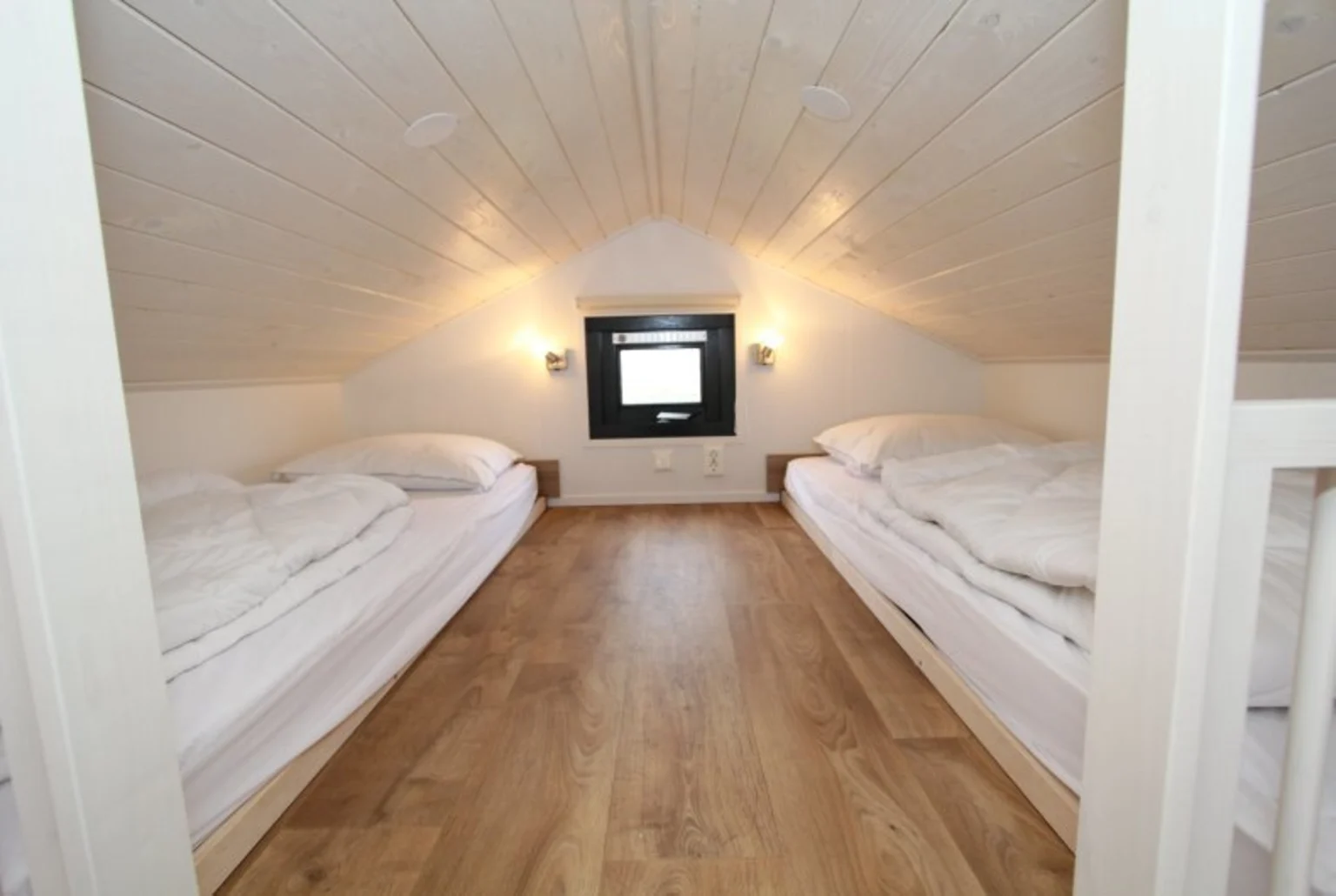 Lodge 4 - Type Lodge is geschikt voor vier personen. Deze knusse recreatiewoning is voorzien van een glazen gevel die u een vrij uitzicht biedt. Verder bevind zich beneden een open keuken in hoekopstelling een badkamer en een slaapkamer. Op de vide die vanuit de woonkamer toegankelijk is kan de tweede slaapvertrek worden bereikt.