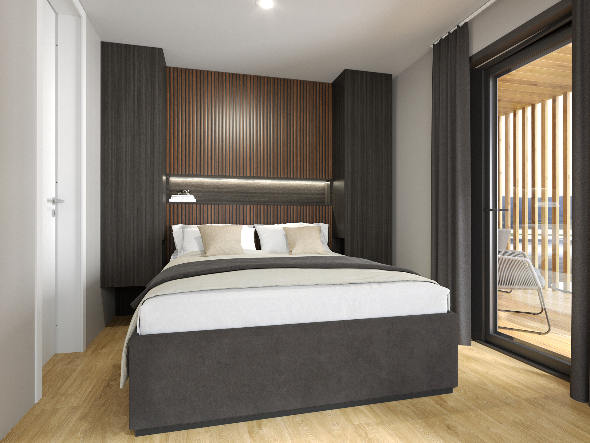 Qua interieur is de voornaamste blikvanger de master bedroom die niet alleen ruim is, maar ook verrijkt is met twee kasten naast elke zijde van het tweepersoonsbed. Hangkasten, een spiegel en haakjes om de jas op te hangen vergroten het comfort nog meer. Een schuifdeur verschaft bovendien rechtstreeks toegang tot het terras. De tweede slaapkamer bestaat uit twee eenpersoonsbedden met daartussen een nachtkastje. Een kledingkast, hangkasten en kledinghaakjes kleuren deze ruimte verder in.
