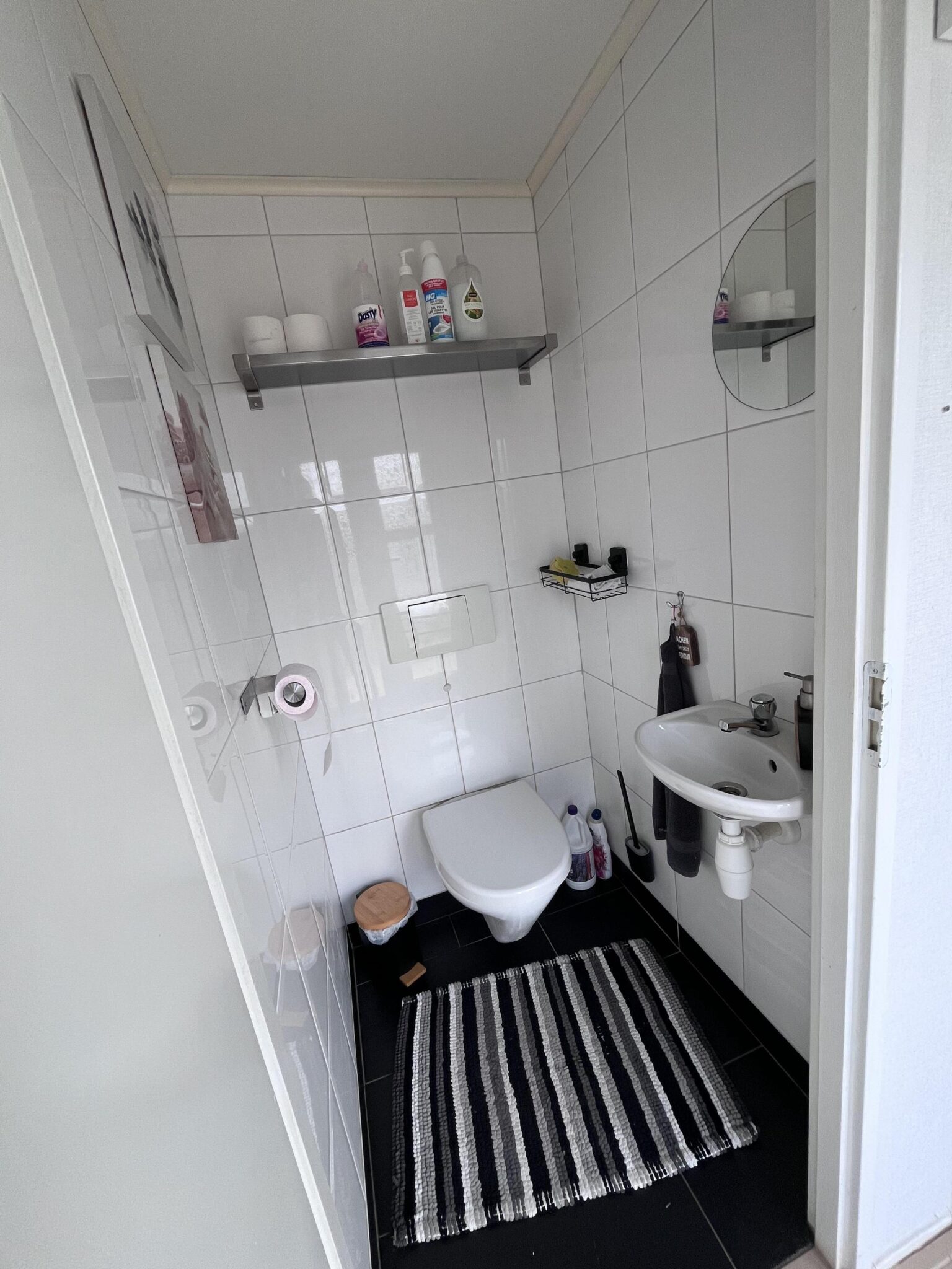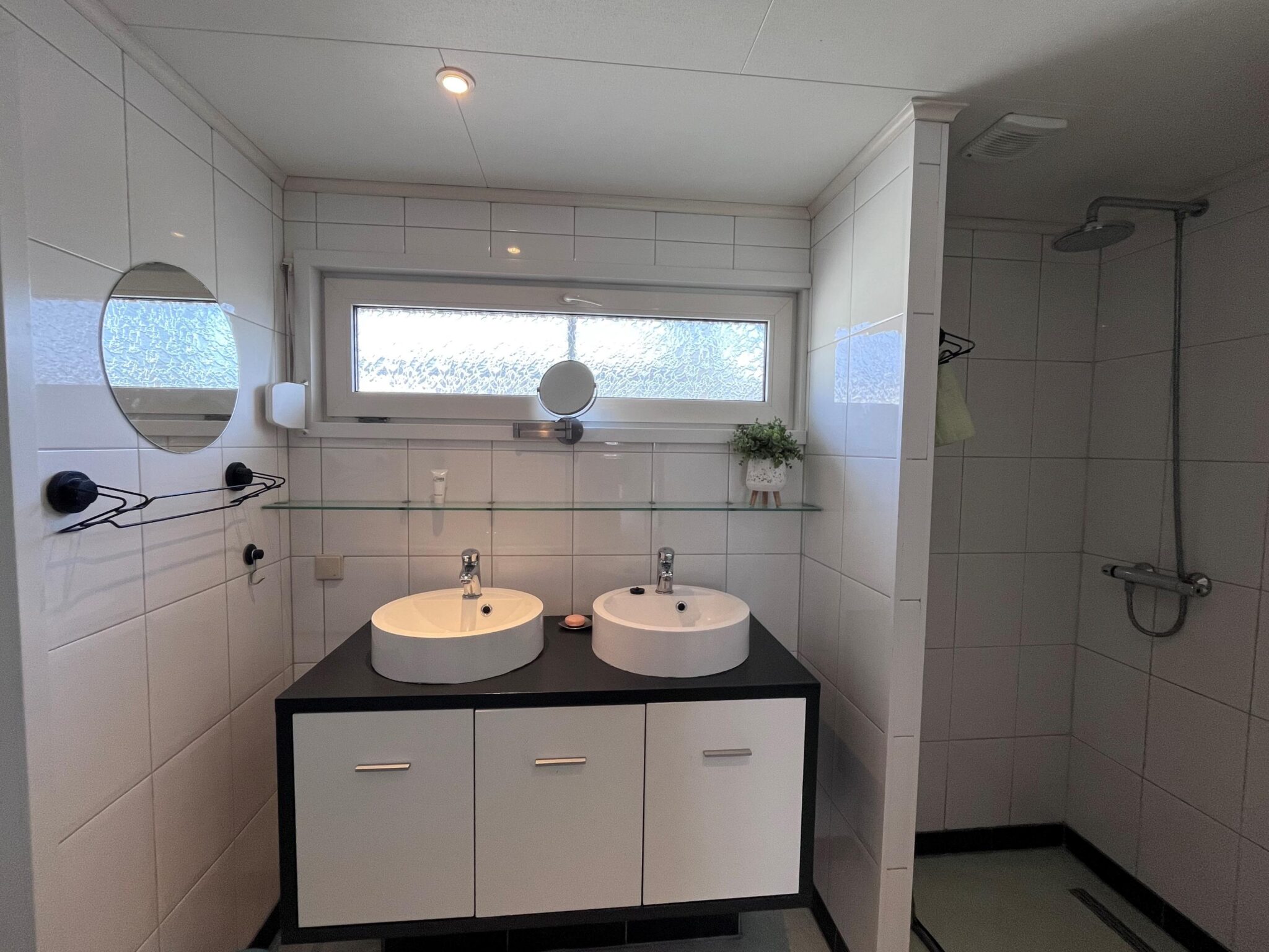 De badkamer is voorzien van een wastafel en inloopdouche. De woning wordt geleverd inclusief het interieur.