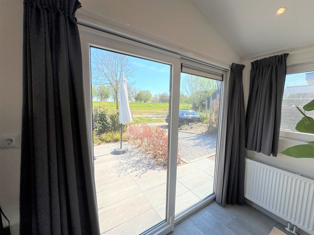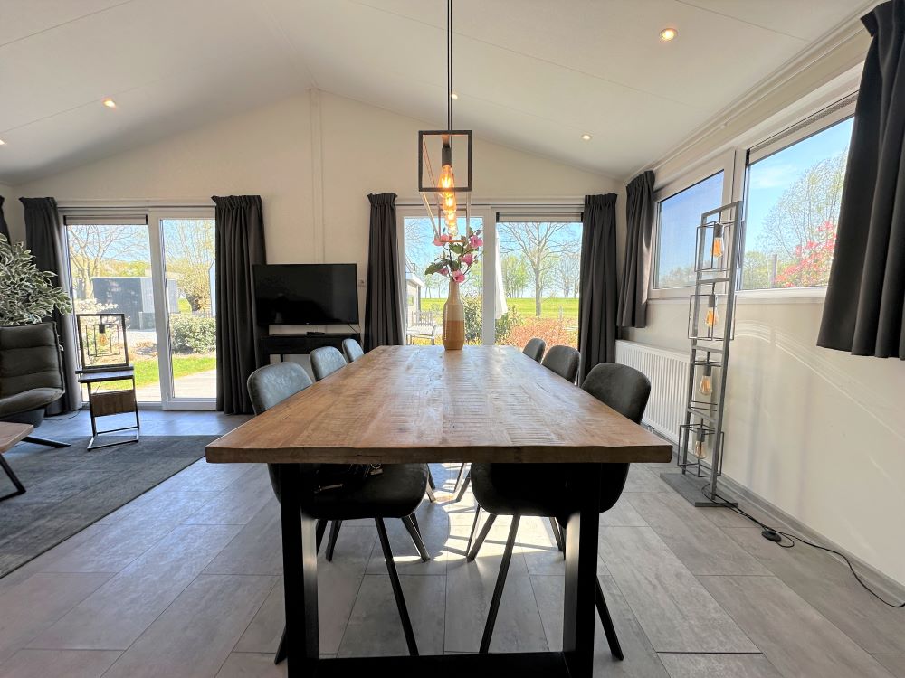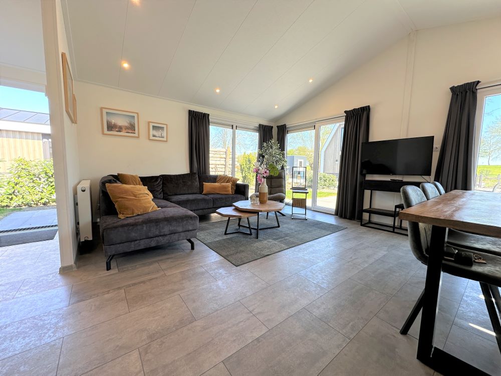 De lichte living valt direct op door de vele grote raampartijen, waardoor u kunt genieten van natuurlijk licht en het unieke uitzicht. In deze open ruimte vindt u een gezellige loungehoek, een ruime eethoek en een moderne open keuken. De loungehoek is sfeervol ingericht met een ruime hoekbank, twee comfortabele fauteuils, een salontafel en een tv-meubel met televisie. De tv-zenders worden ontvangen via een CAI-aansluiting en er is WiFi aanwezig. Door de airco blijft het hier aangenaam vertoeven in de zomer.