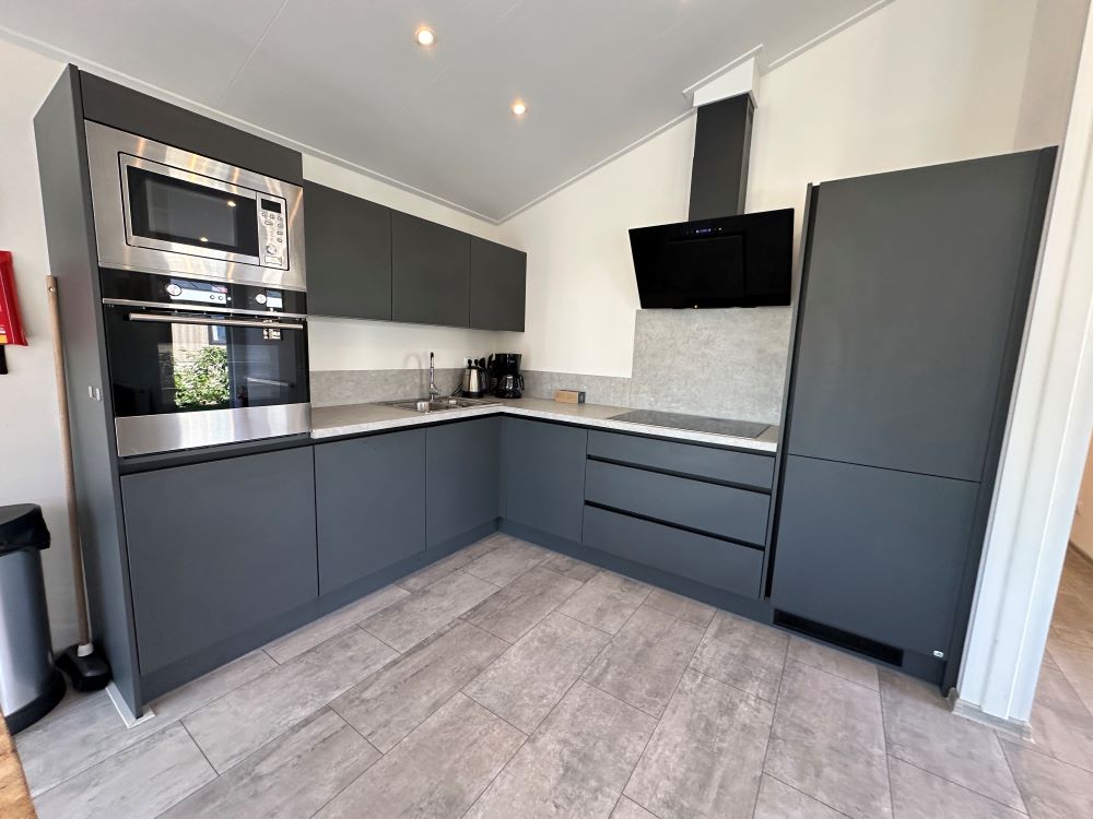 De eethoek biedt plaats aan zes personen dankzij de royale eettafel met bijpassende stoelen. De strak afgewerkte open keuken is voorzien van een koel-vriescombinatie, oven, combimagnetron, vaatwasser en een elektrische kookplaat met afzuigkap, zodat koken hier een plezier wordt.