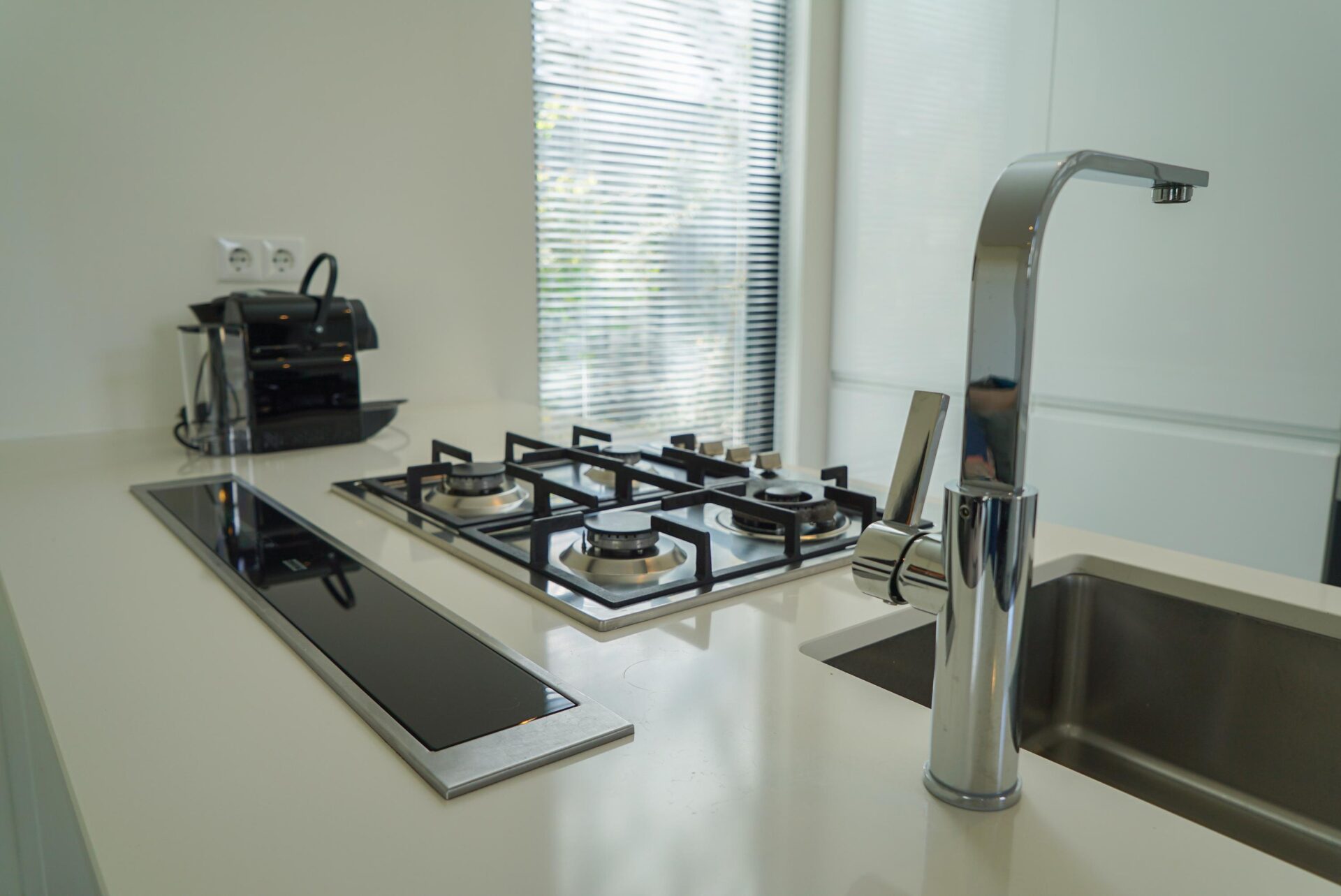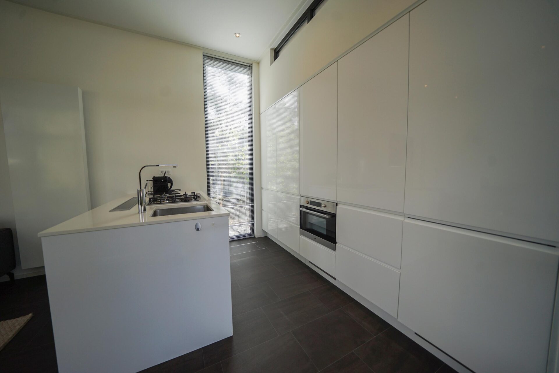 Het gevoel van rust en ruimte is ook van toepassing wanneer u de woning binnengaat. U komt direct in de grote living met open keuken die bestaat uit een keukenblok en alle benodigde keukenaccessoires. Dit laatste houdt in dat u beschikt over een kookplaat, afzuigkap, koel-vriescombinatie, vaatwasser, magnetron, oven en een kraan met daaronder een rvs spoelbak.