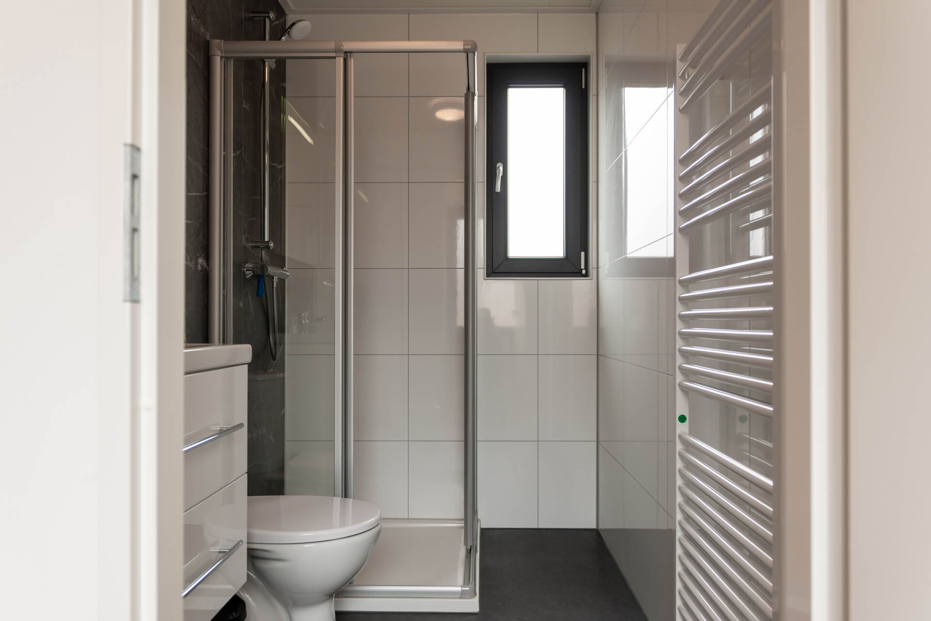 Deze recreatiewoning heeft twee slaapkamers, een met een tweepersoonsbed en een met twee eenpersoonsbedden met een nachtkastje ertussen. Beide slaapkamers beschikken, buiten de nachtkastjes om, over genoeg opbergruimte. De badkamer is volledig betegeld en is verder ingericht met een douchecabine, wastafel met spiegel, toilet en designradiator.