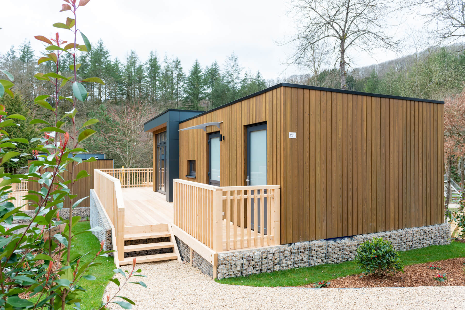 Cube La Mer 4 - Een robuust aanzien met een warm en toch ruimtelijke uitstraling, dat is de Cube la Mer in een notendop. Deze gelijkvloerse 4-persoons recreatiewoning is gebouwd op een verhoging dat op architectonisch fraaie wijze is ingekleurd met Ardenner breukstenen, passend bij de omgeving. Dat is het voornaamste robuuste attribuut aan dit type woning, het ruimtelijke aspect wordt gesymboliseerd door ten eerste de grootse veranda die door haar omvang ook veel weg heeft van een balustrade. Vanaf daar en vanuit de living, die wordt omlijst door grote raampartijen, heeft u een mooi uitzicht op de heuvelachtige omgeving. De openslaande deuren naar het terras zorgen voor bovendien voor nog meer vakantiebelevenis.