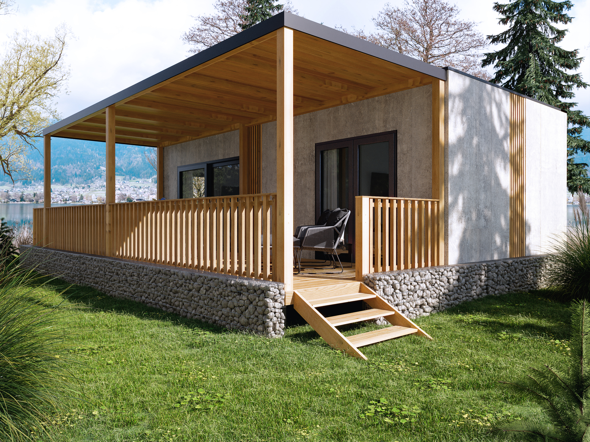 Seerose - Het vakantieverblijf van 9 meter lang, 4,5 meter breed en 3,5 meter hoog oogt en voelt bij de eerste indruk al als thuis. De kleur antraciet versterkt de kwaliteitsrijke uitstraling van deze 2-persoons vakantiewoning nog meer, net als de houtlookelementen die aansluiten bij de bosrijke omgeving. Het terras, waar u vanuit de living zo opstapt dankzij de schuifdeuren, staat verder garant voor een mooi uitzicht over de Ossiacher See en de omringende bergflanken. Dit terras, dat rondom het vakantieverblijf wordt gebouwd, is gemaakt van geïmpregneerd dennenhout.