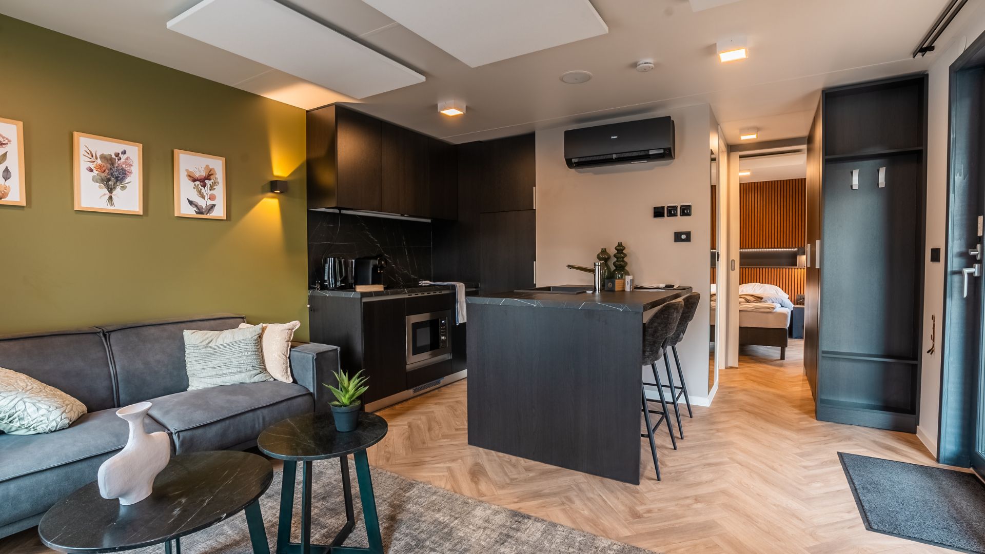 Ook de woonkamer is ruim te noemen met een royale zit- en loungehoek en een fraaie open keuken met kookeiland. Deze keuken bestaat uit een kraan met rvs spoelbak, een vaatwasser, een inbouwkoelkast en vriezer, een ingebouwde magnetron en oven en een afzuiging boven de kookplaat. Een fraaie garderobe in de hal tussen de slaap en woonkamer bevestigt de algemene indruk van deze vakantiewoning. Aan de andere kant van de garderobe is de complete badkamer gesitueerd die is ingericht met een ruime douchecabine, toilet en wastafel met fontein en spiegel.