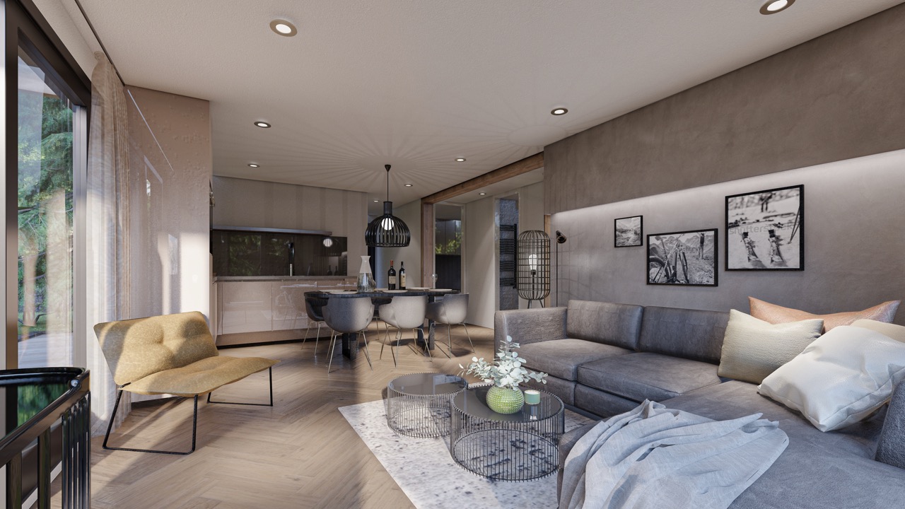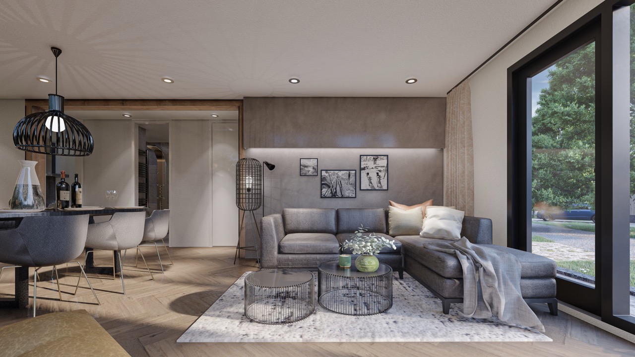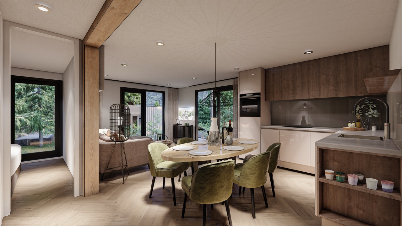 Wulfenia 6 - Deze vakantiewoning van 8,9 meter lang, 6,8 meter breed en 3,5 meter hoog oogt en voelt bij de eerste indruk al als thuis. De kleur antraciet versterkt de kwaliteitsrijke uitstraling van deze 6-persoons vakantiewoning nog meer, net als de houtlookelementen die aansluiten bij de bosrijke omgeving. Het terras, waar u vanuit de living zo opstapt dankzij de schuifdeuren, staat verder garant voor een mooi uitzicht over de Pressegger See en de omringende bergflanken. Dit terras, dat rondom de vakantiewoning wordt gebouwd, is gemaakt van geïmpregneerd dennenhout, net als het hekwerk en de poort ertoe.