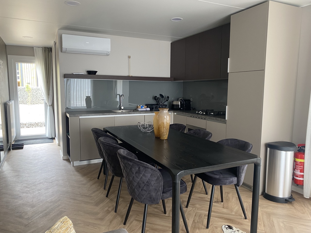 De royale living is echter om meer redenen sfeervol te noemen: ze herbergt een grote zit- en loungehoek en een fraaie open keuken in een L-vorm. Deze keuken bestaat uit een kraan met rvs spoelbak, een vaatwasser, een inbouwkoelkast en -vriezer, een ingebouwde magnetron en een afzuiging boven de kookplaat. De badkamer is ingericht met een ruime douchecabine, toilet en wastafel met fontein en spiegel.