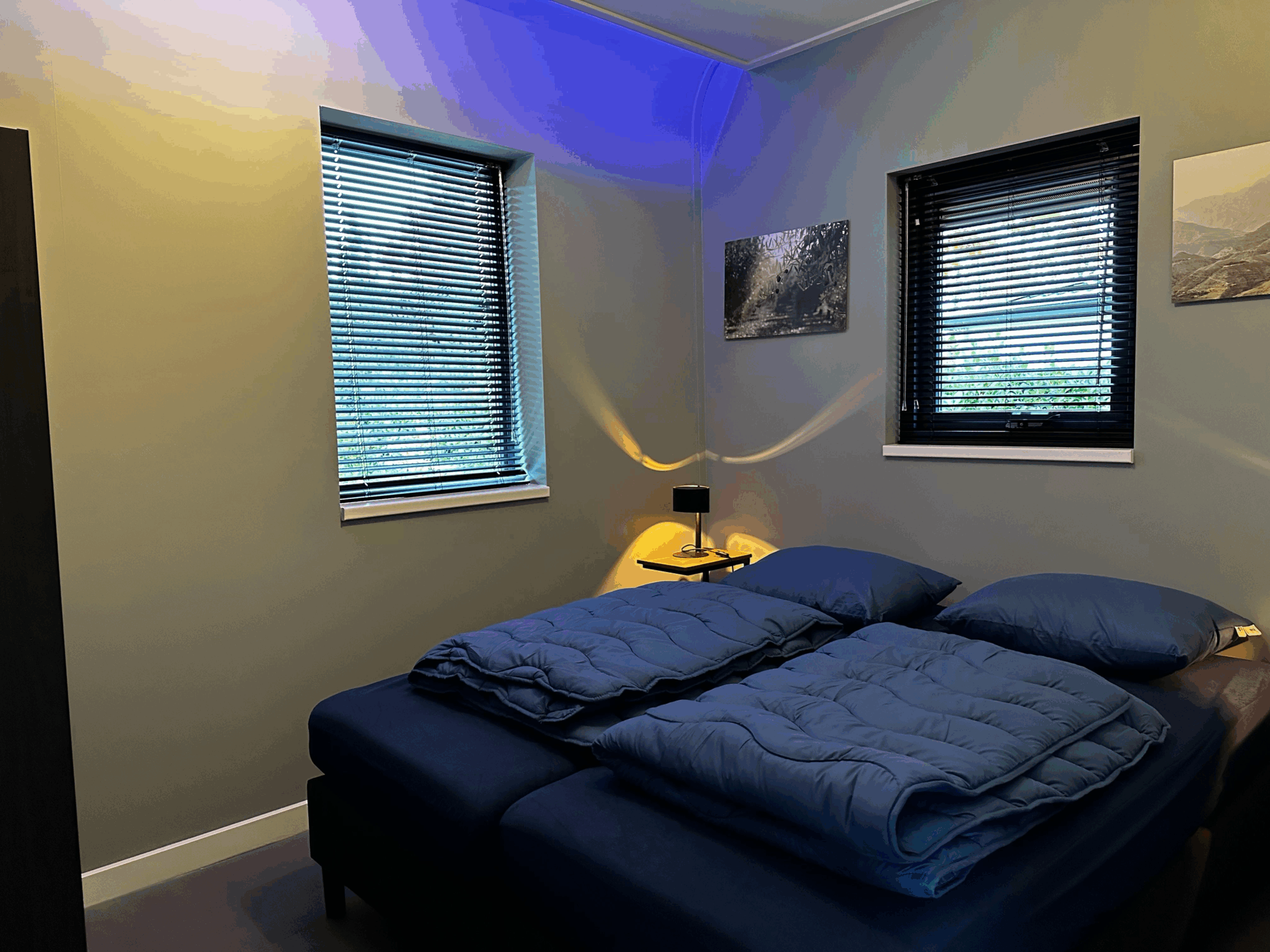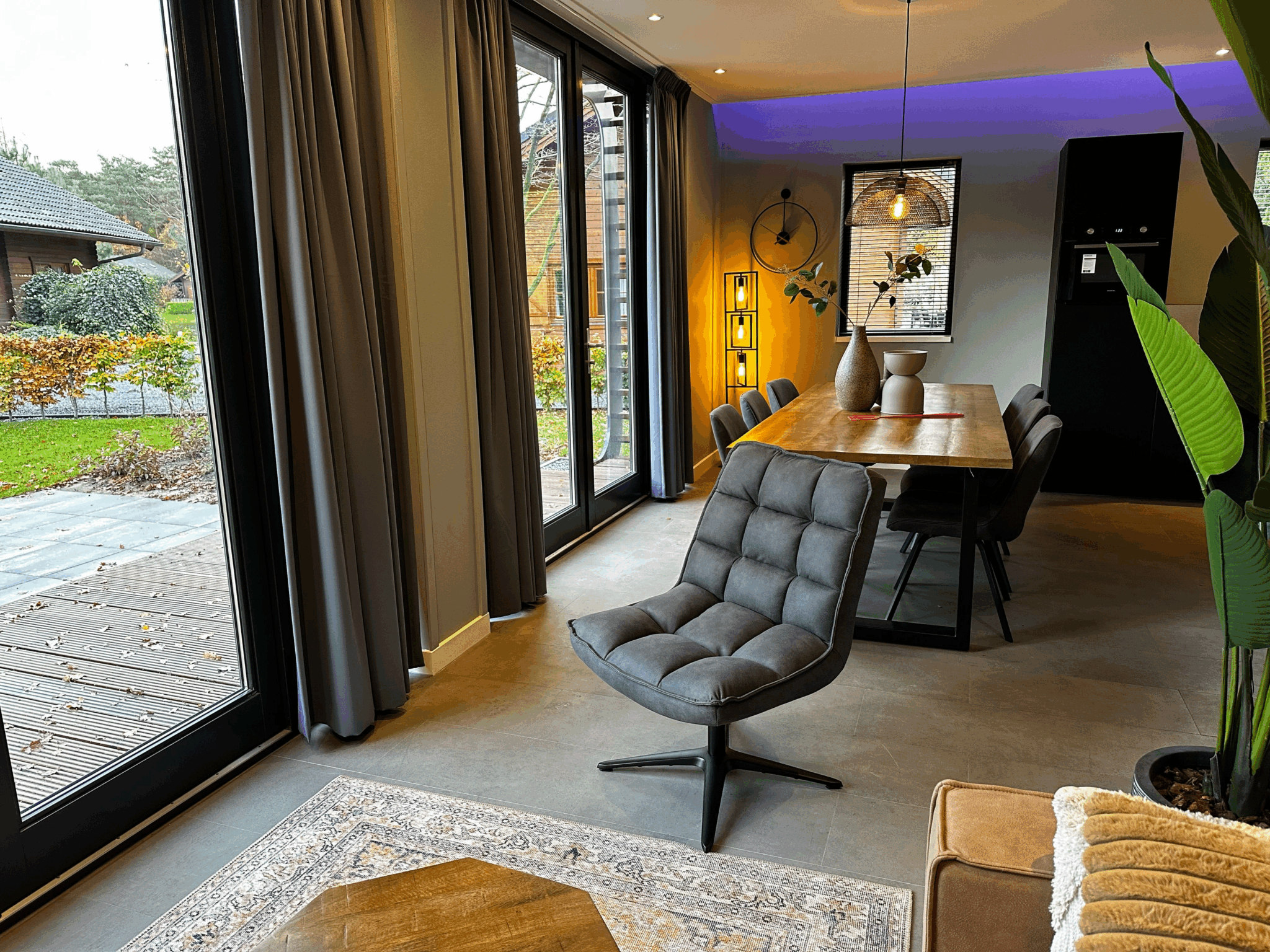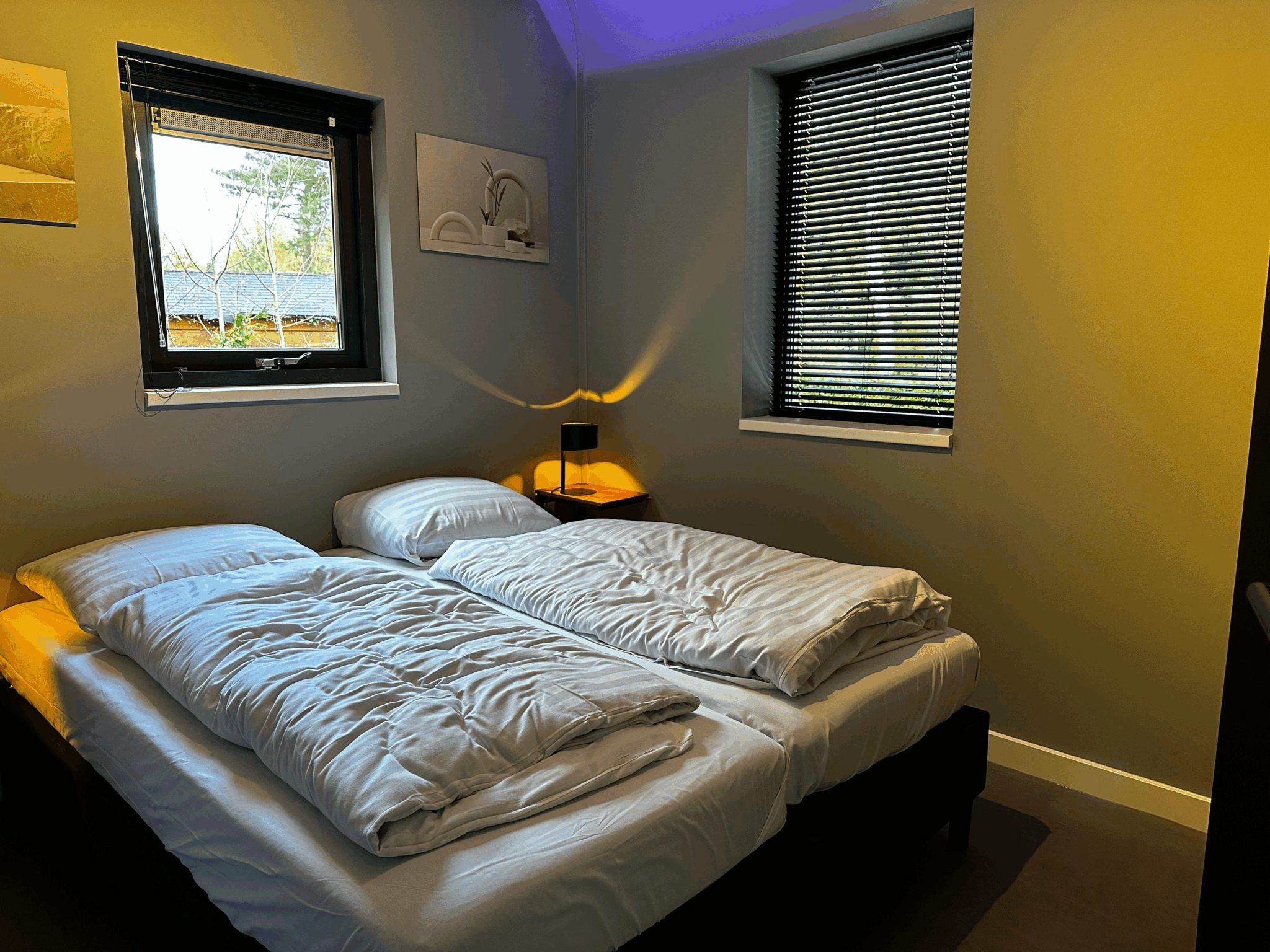 Modus Wellness 4 - De Modus Wellness 4 is een chalet met heerlijke wellnessfaciliteiten. Het gelijkvloerse en vrijstaande chalet biedt plaats aan 4 personen. Er zijn twee slaapkamers aanwezig, een eethoek en zithoek met televisie. Er is een badkamer met ruime regendouche, wastafel, toilet en elektrische sauna. De keuken is uitgerust met een vaatwasser, koelkast en een koffiezetapparaat.