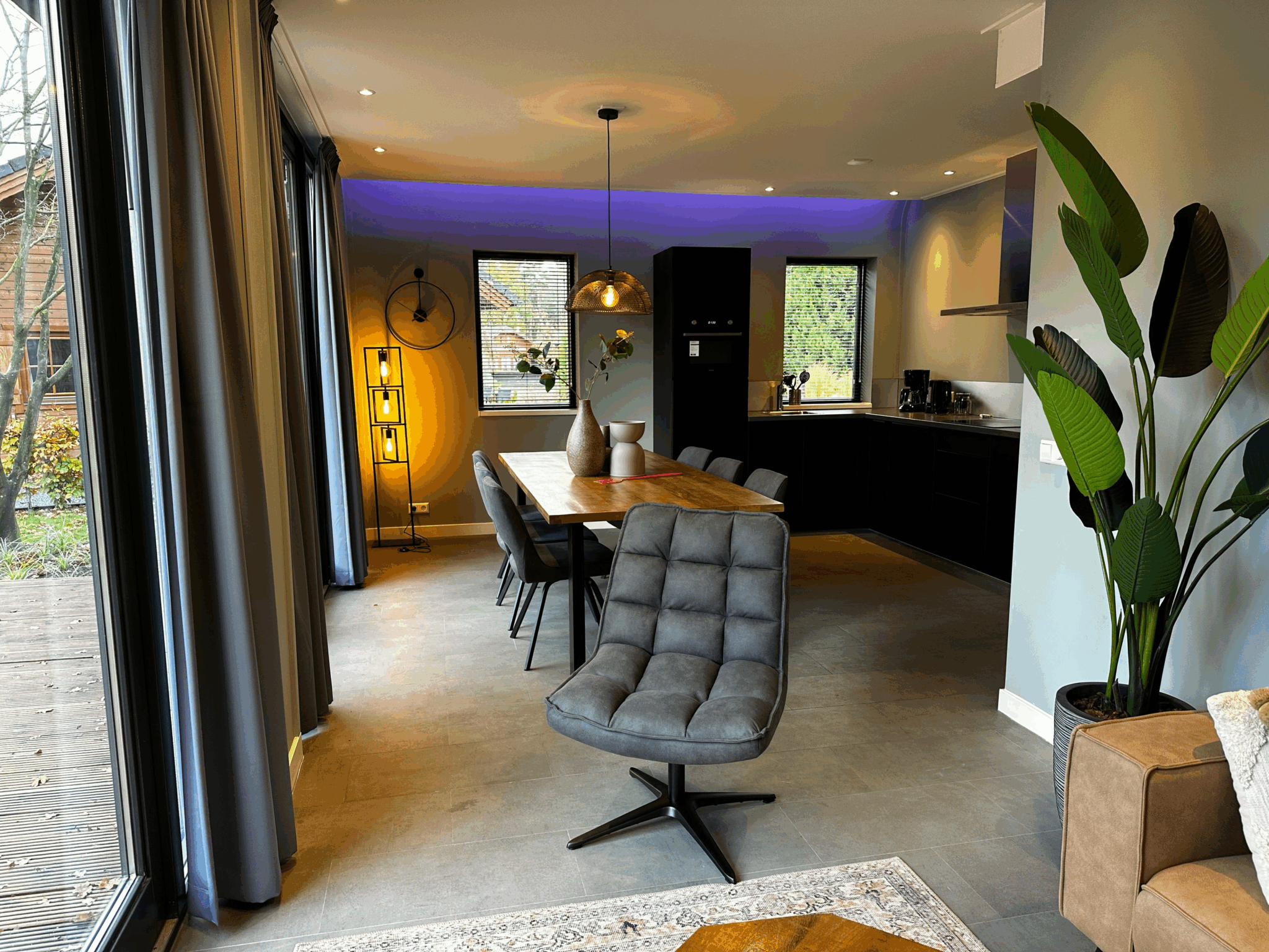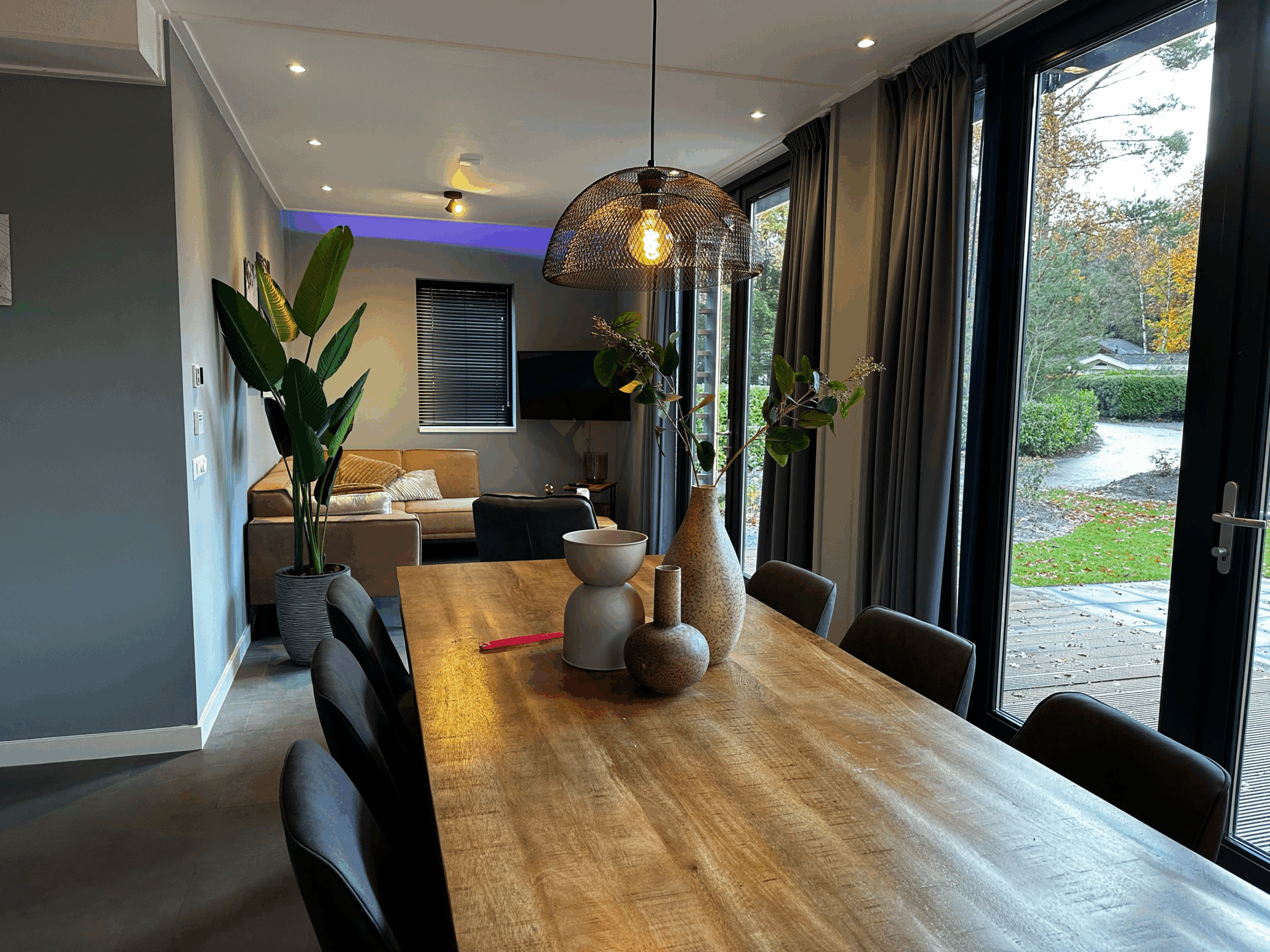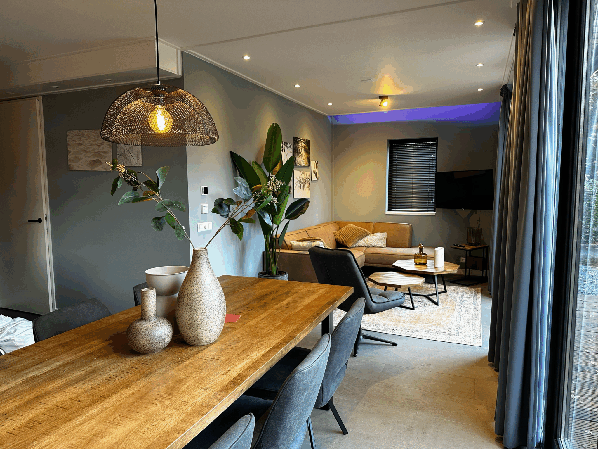Modus Wellness 4 - De Modus Wellness 4 is een chalet met heerlijke wellnessfaciliteiten. Het gelijkvloerse en vrijstaande chalet biedt plaats aan 4 personen. Er zijn twee slaapkamers aanwezig, een eethoek en zithoek met televisie. Er is een badkamer met ruime regendouche, wastafel, toilet en elektrische sauna. De keuken is uitgerust met een vaatwasser, koelkast en een koffiezetapparaat.