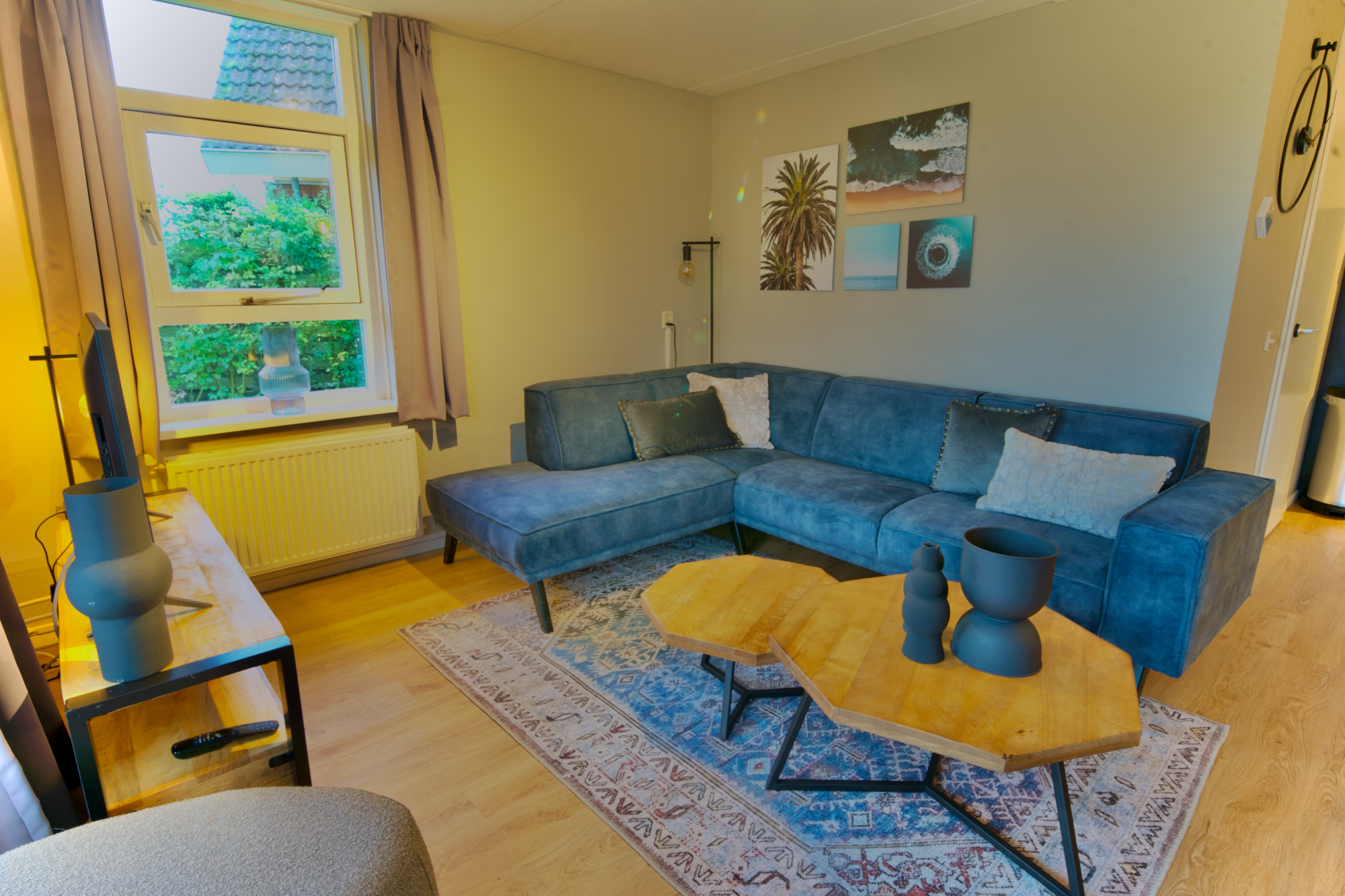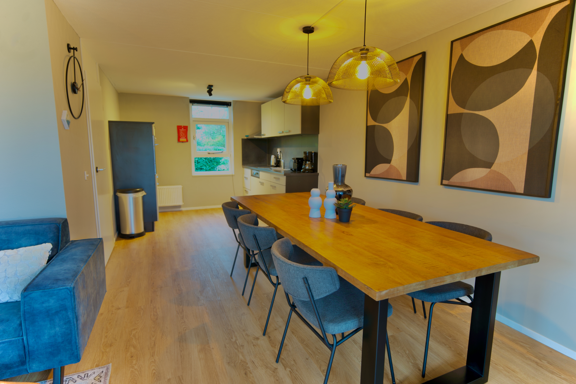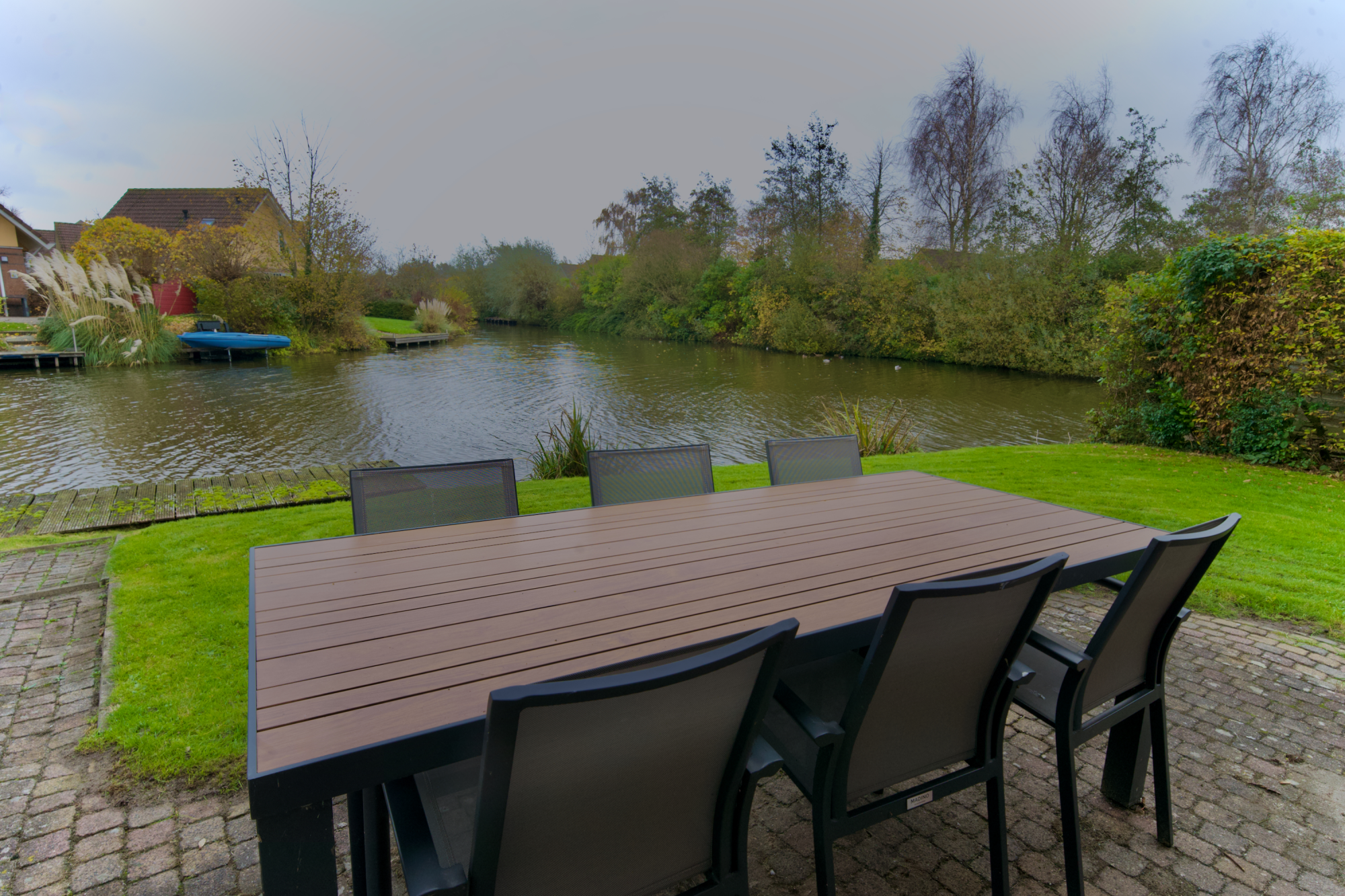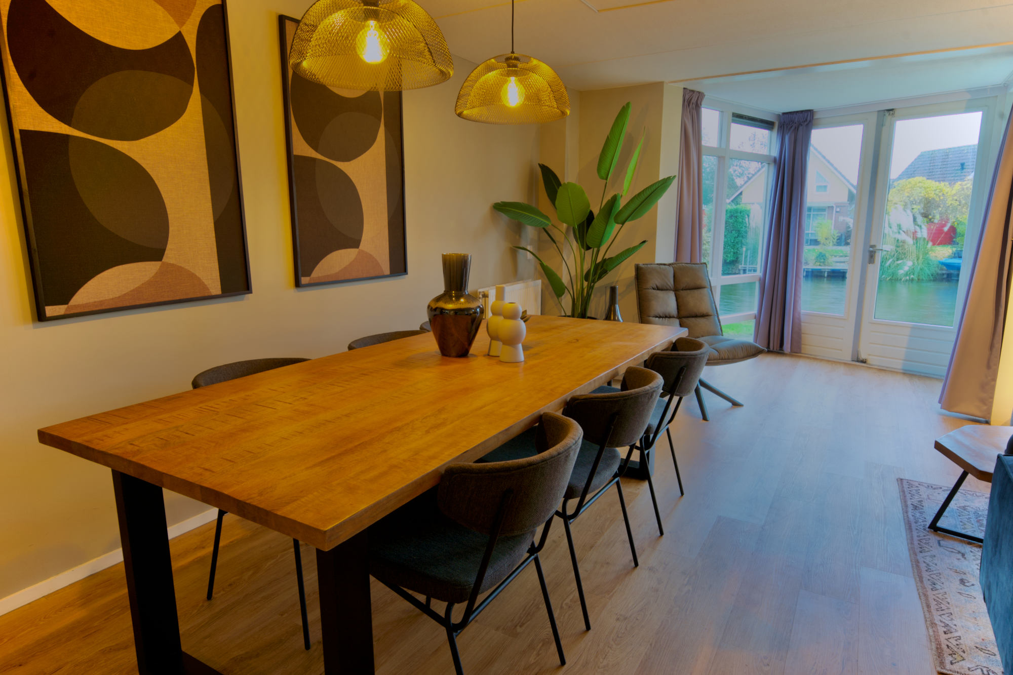 De sfeervolle woonkamer herbergt een ruime loungehoek met comfortabele bank, luxe fauteuils, een salontafel en televisie (CAI-aansluiting aanwezig). Grote ramen en openslaande deuren zorgen voor veel natuurlijk licht en een prachtig uitzicht op de tuin en het water. De open keuken is stijlvol afgewerkt en uitgerust met een koel-vriescombinatie, oven, gasfornuis met afzuigkap en vaatwasser. De grote eethoek met zes stoelen sluit hier perfect op aan.