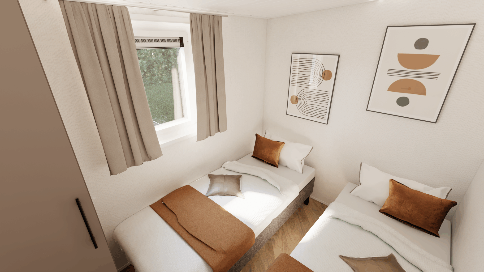 Pavillon Horizon -  van ongeveer 45m2 is perfect voor 4 personen en biedt alle comfort en ruimte die je zoekt. De Pavillon Horizon heeft twee ruime slaapkamers en een luxe badkamer met douche. De trendy keuken is uitgerust met een vaatwasser en combimagnetron, zodat je in een handomdraai heerlijke maaltijden kunt bereiden. Vloerafwerking en stoffering zijn inbegrepen, dus je kunt meteen starten met het inrichten van jouw nieuwe thuis. Ook zijn er opbergkasten en kledingkasten aanwezig, waardoor je meteen genoeg opbergruimte hebt.