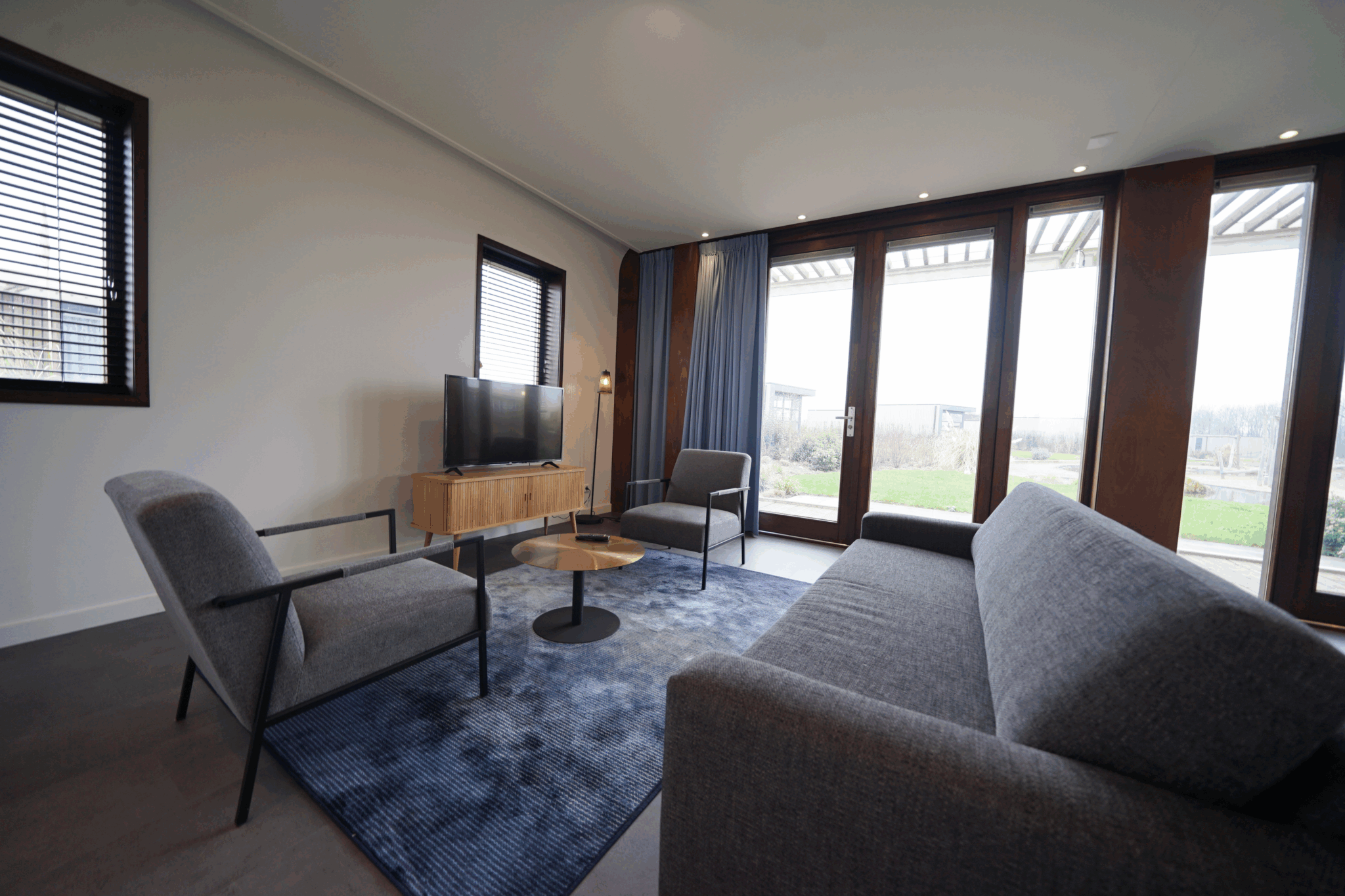 Modus 4 - Het trendy exterieur van Modus 4 doet je verrassen en geeft een unieke indruk van de nieuwste generatie van recreatiewoningen. De ronde vormen zijn aantrekkelijk in het ontwerp verwerkt en geven echt het ‘wauw’ gevoel. De woonkamer heeft een grote glaspartij waarmee je een panoramisch uitzicht hebt. Aangrenzend is de masterbedroom waar het heerlijk vertoeven is, uiteraard kun je vanuit de bed lekker TV kijken.